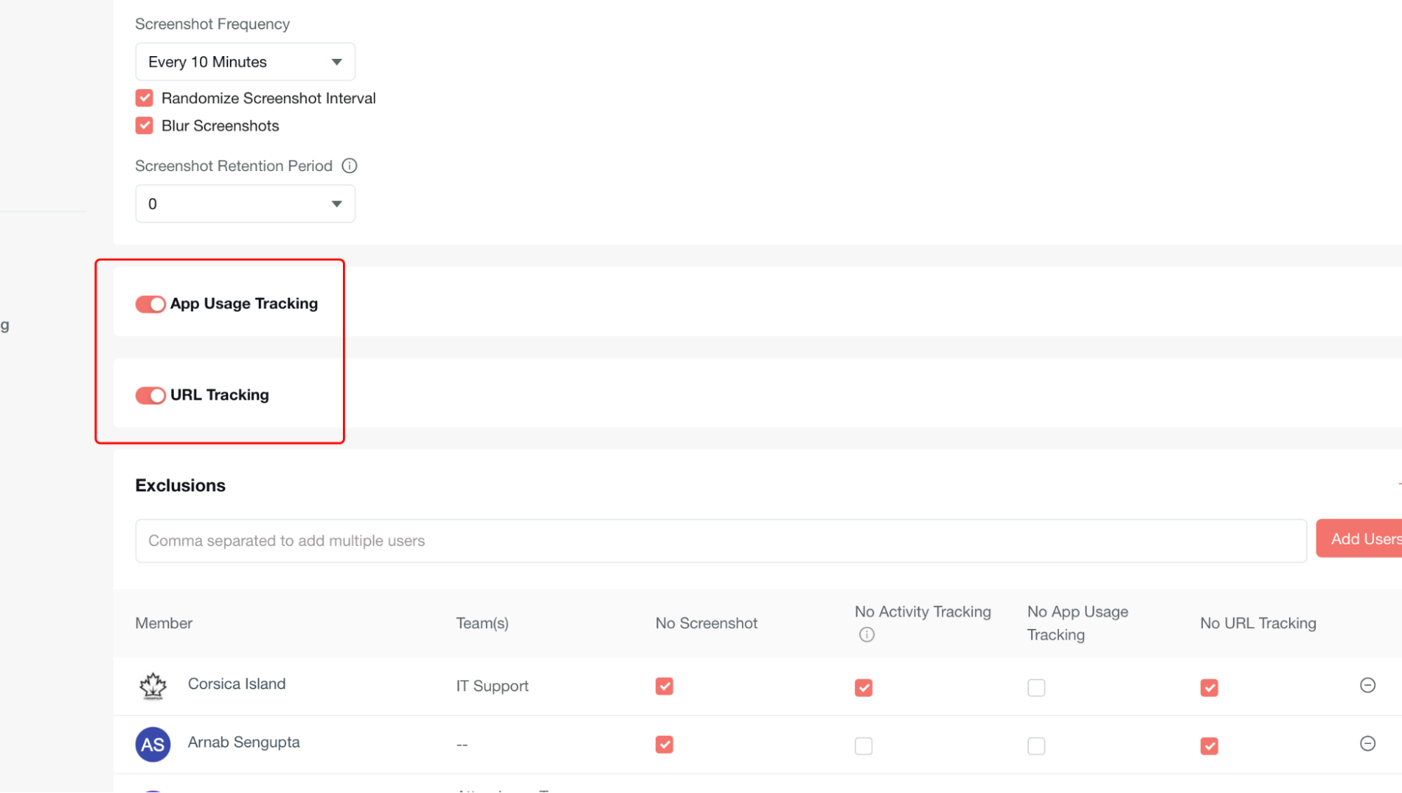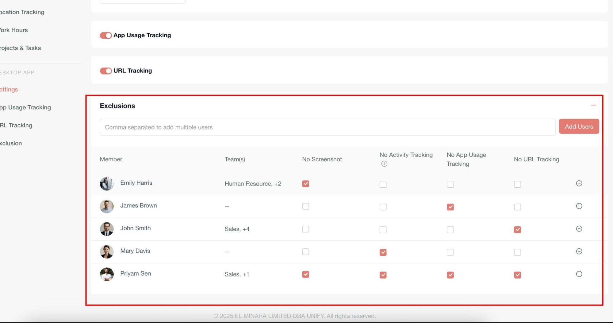 Admins can exclude specific users from certain monitoring features. This allows flexibility for members who should not be tracked in particular areas.