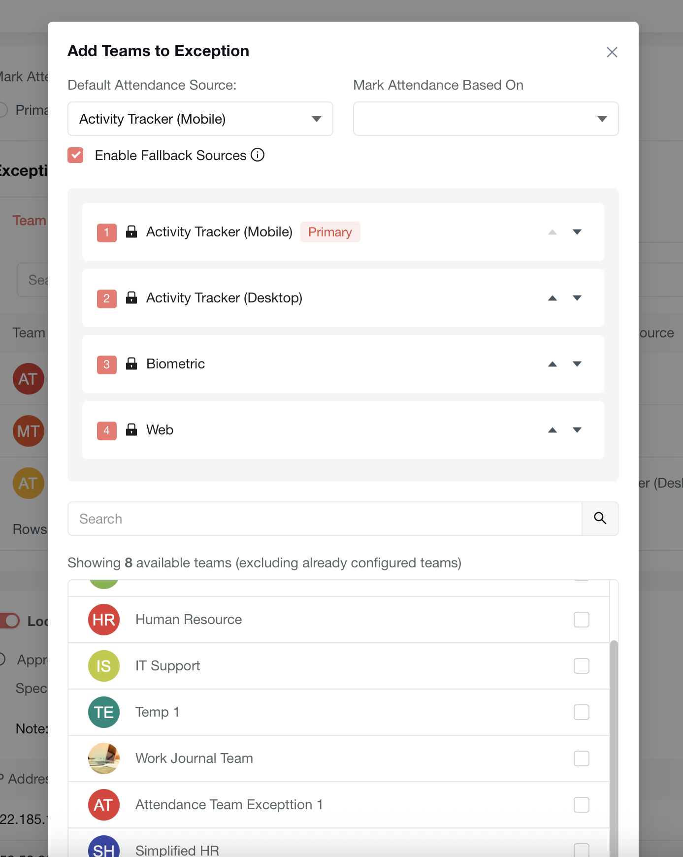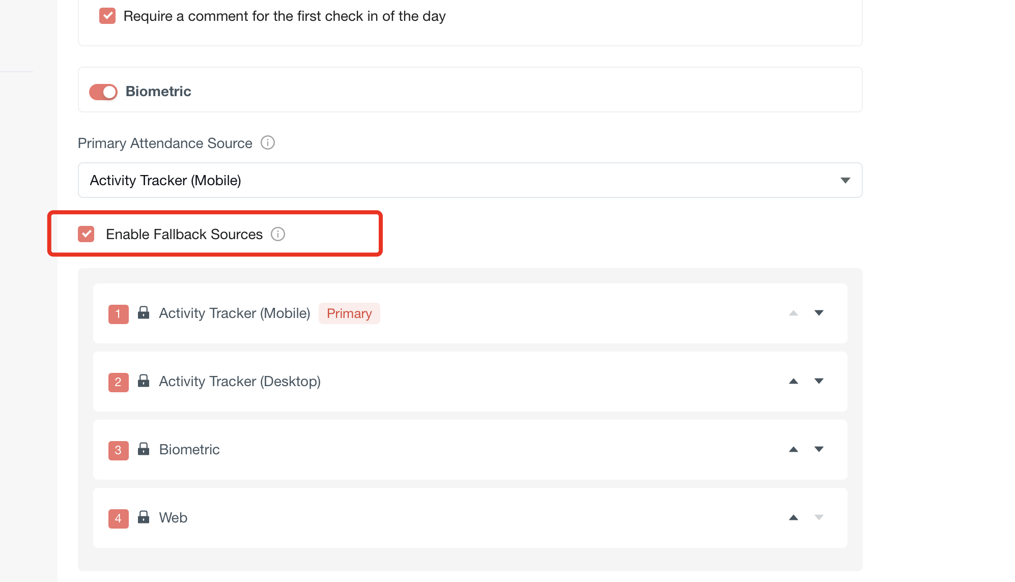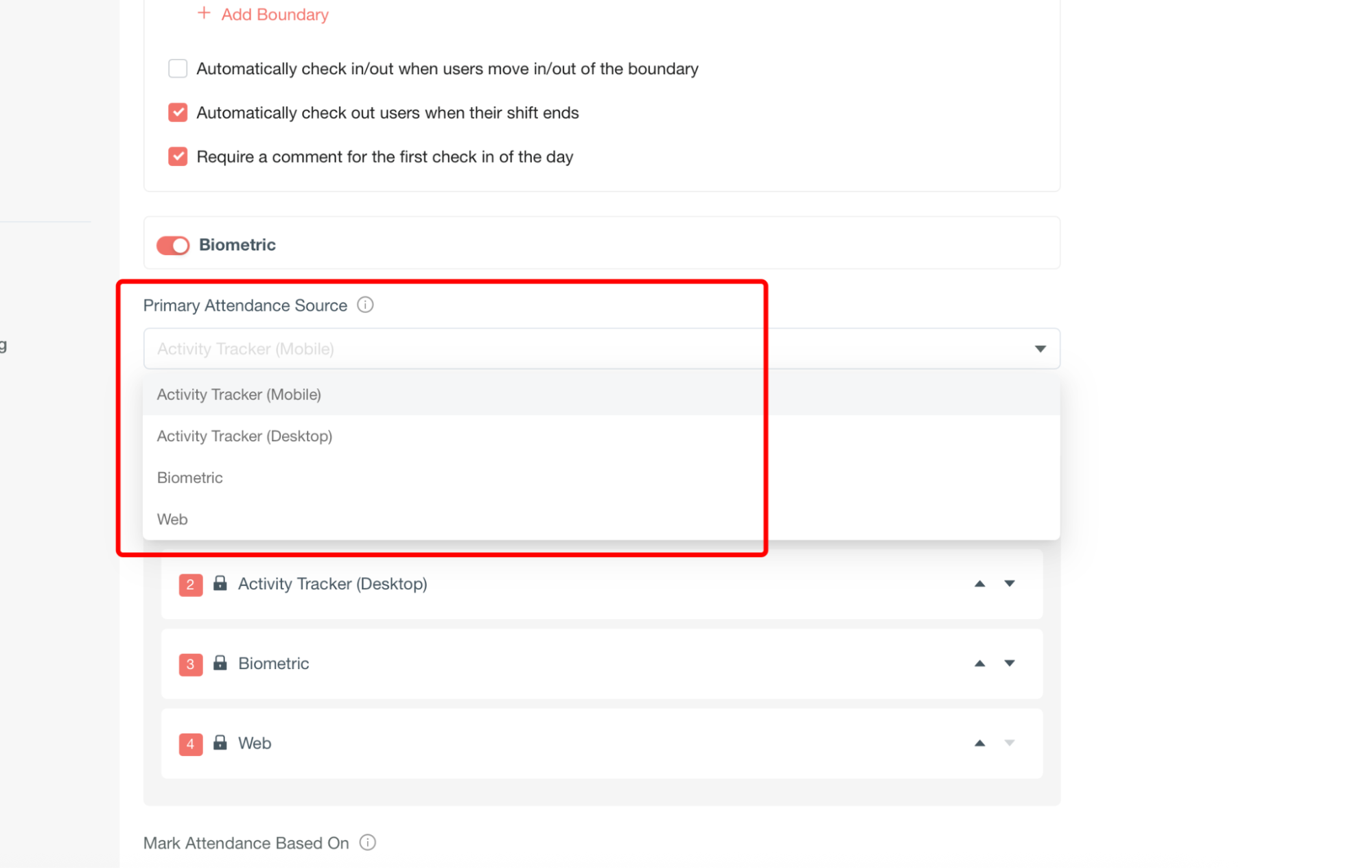 Admins can select it as an attendance source and assign its priority order among other sources (e.g., Mobile, Biometric, Web).