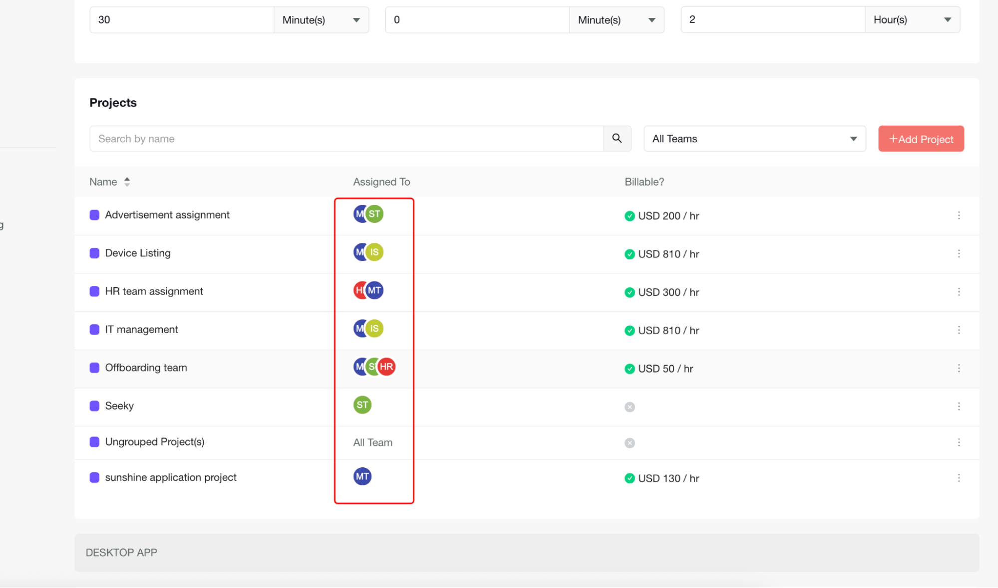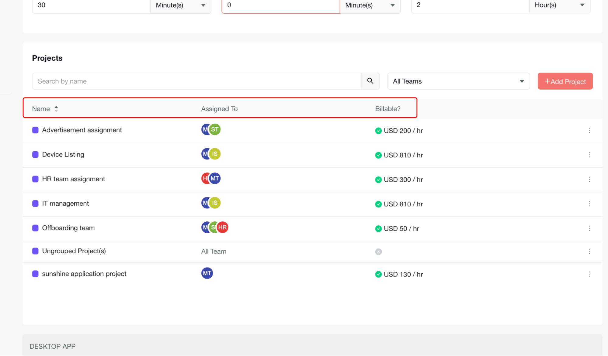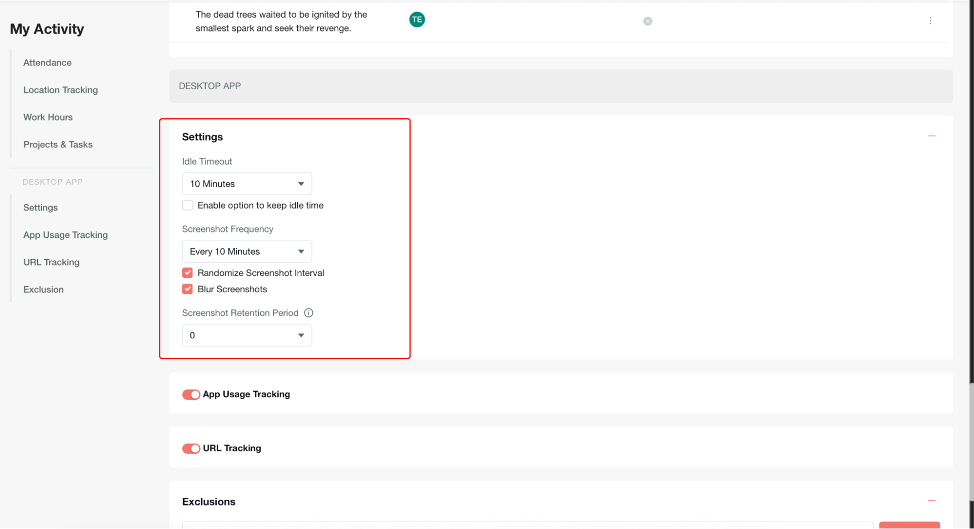 In the Settings section, admins can configure how the Desktop App behaves in terms of idle time handling and screenshot capturing.