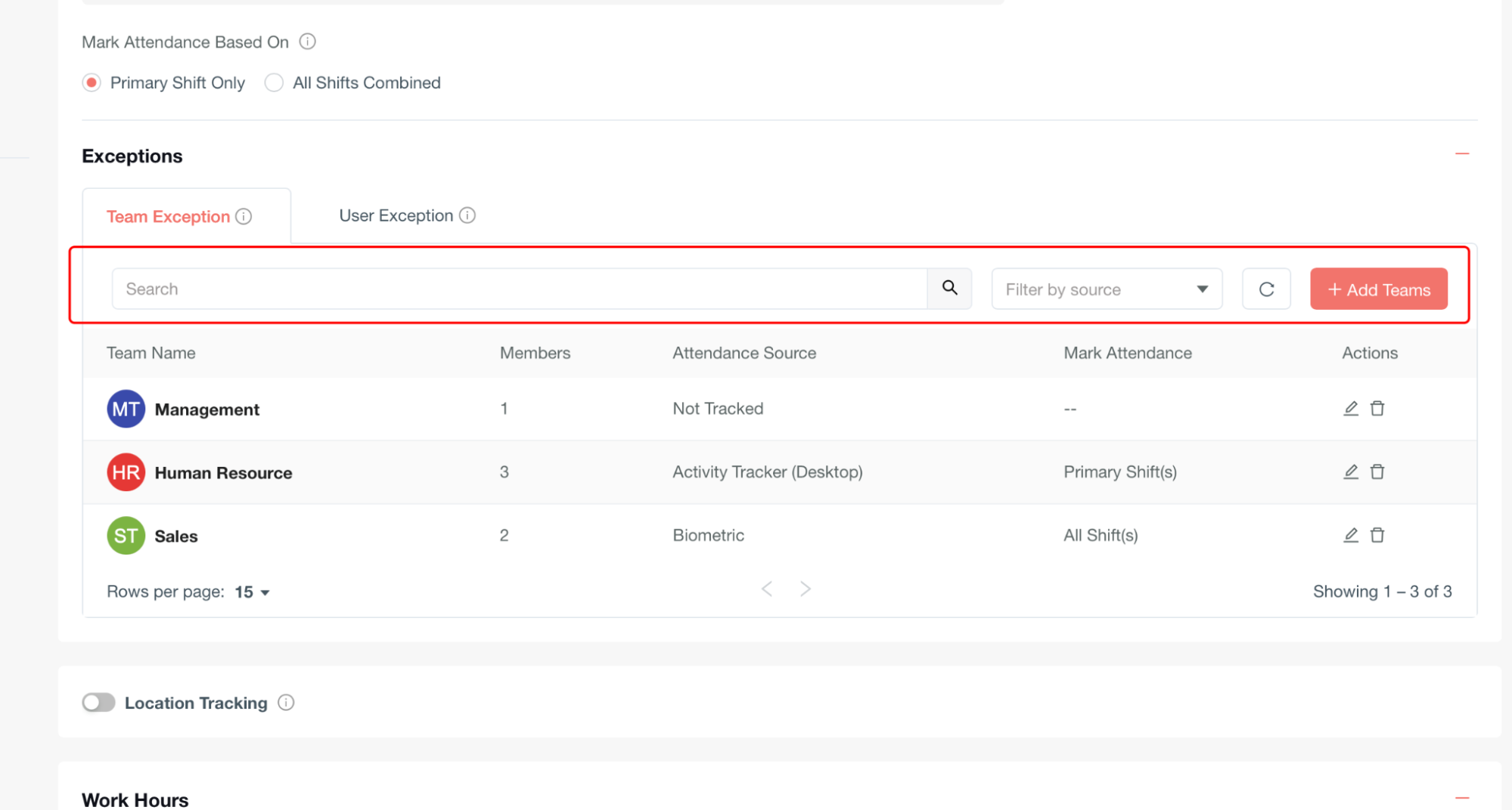 Filter by Source – Dropdown filter to display teams based on their attendance source (e.g., Desktop, Mobile, Biometric, etc.).