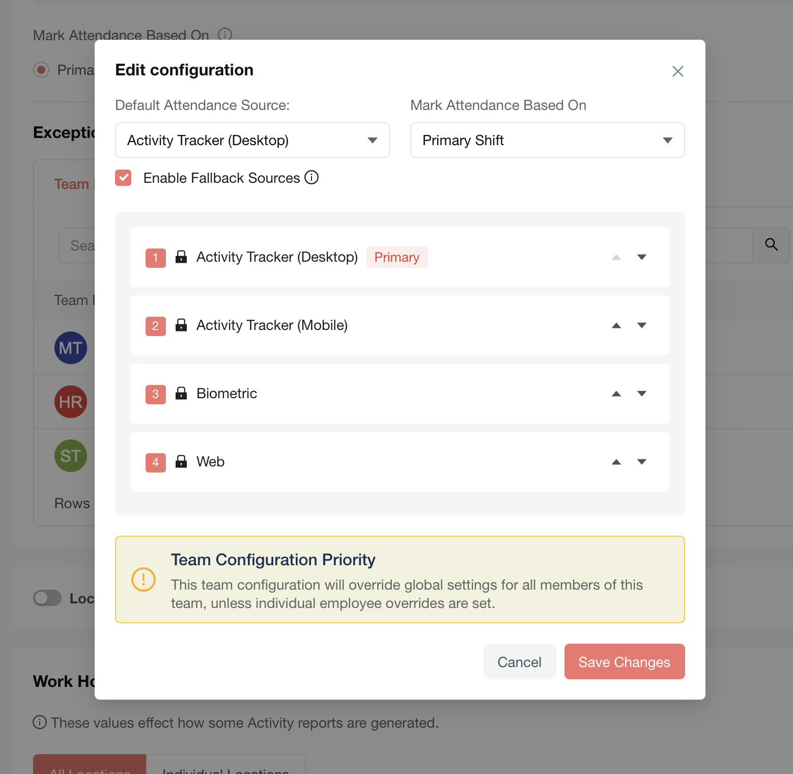 Default Attendance Source – Choose the primary method for tracking team attendance (e.g., Desktop, Mobile, Biometric, Web).