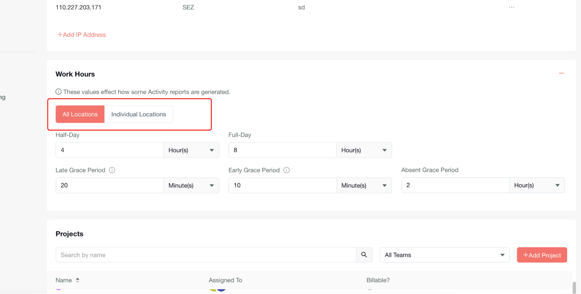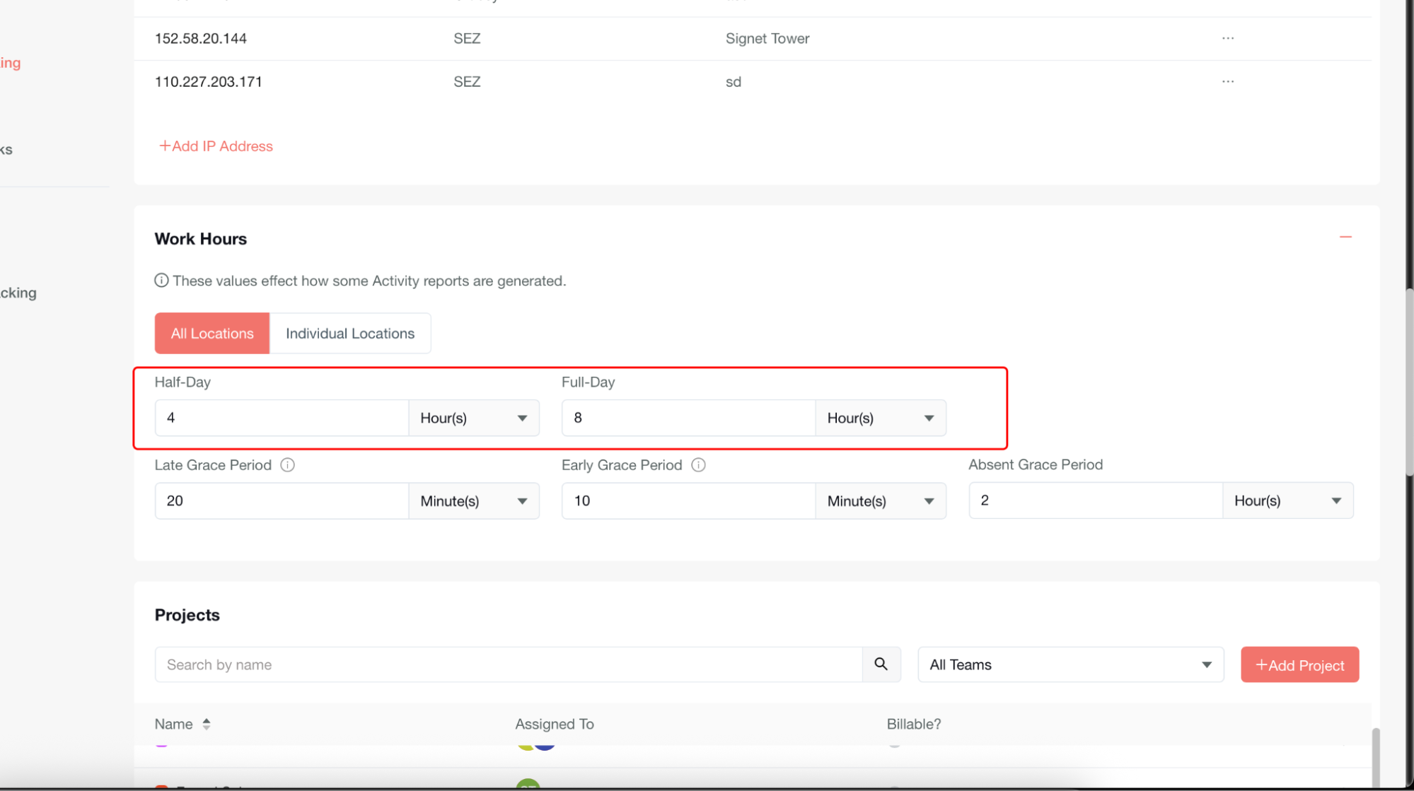 Pay attention to the notice at the top: "These values effect how some Activity reports are generated." Your work hours configuration directly influences: