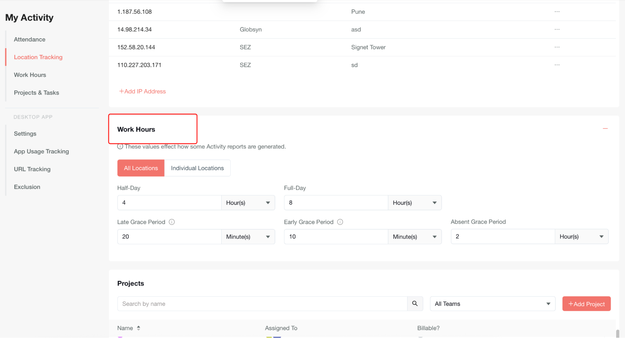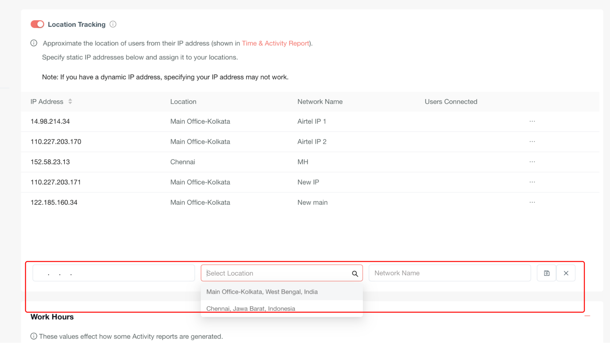 The Location Tracking module helps determine whether users are working from the office or remotely by validating their connected IP address against the configured list.