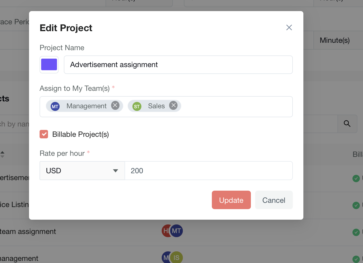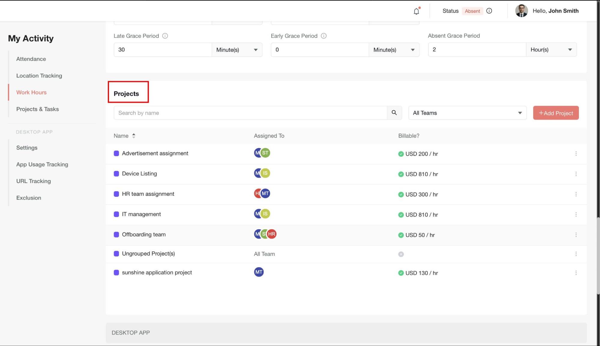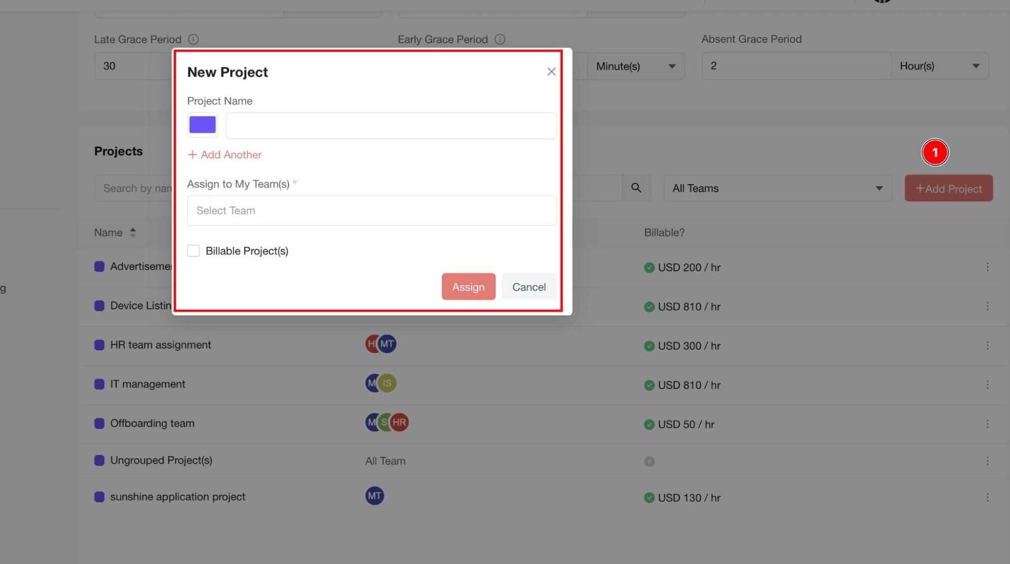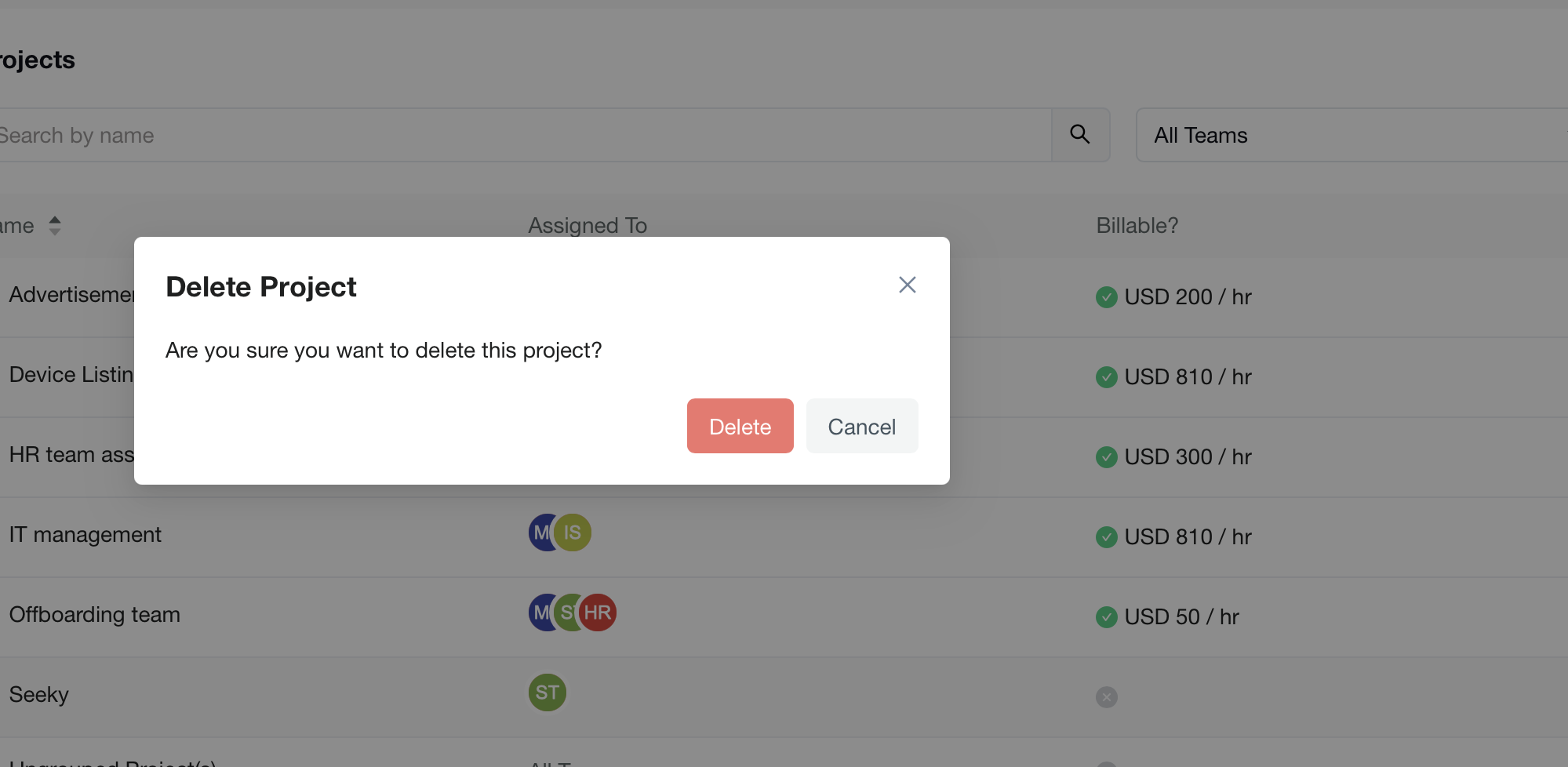 The Projects module setting provides a centralized interface for managing all organizational projects, including project creation, assignment, billing configuration, and team management.