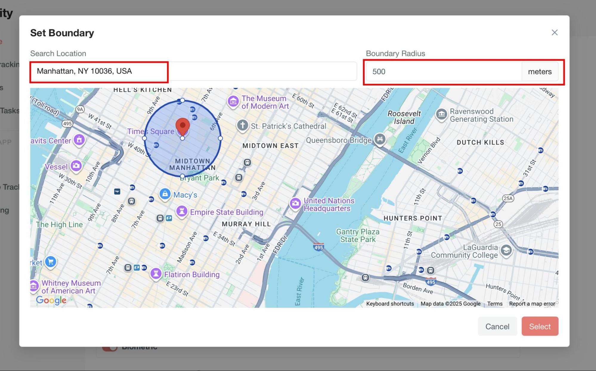 - Add Boundary: Admin can configure the boundary by selecting a location and setting the radius in meters. All geo-fencing–based settings will apply within this defined boundary.