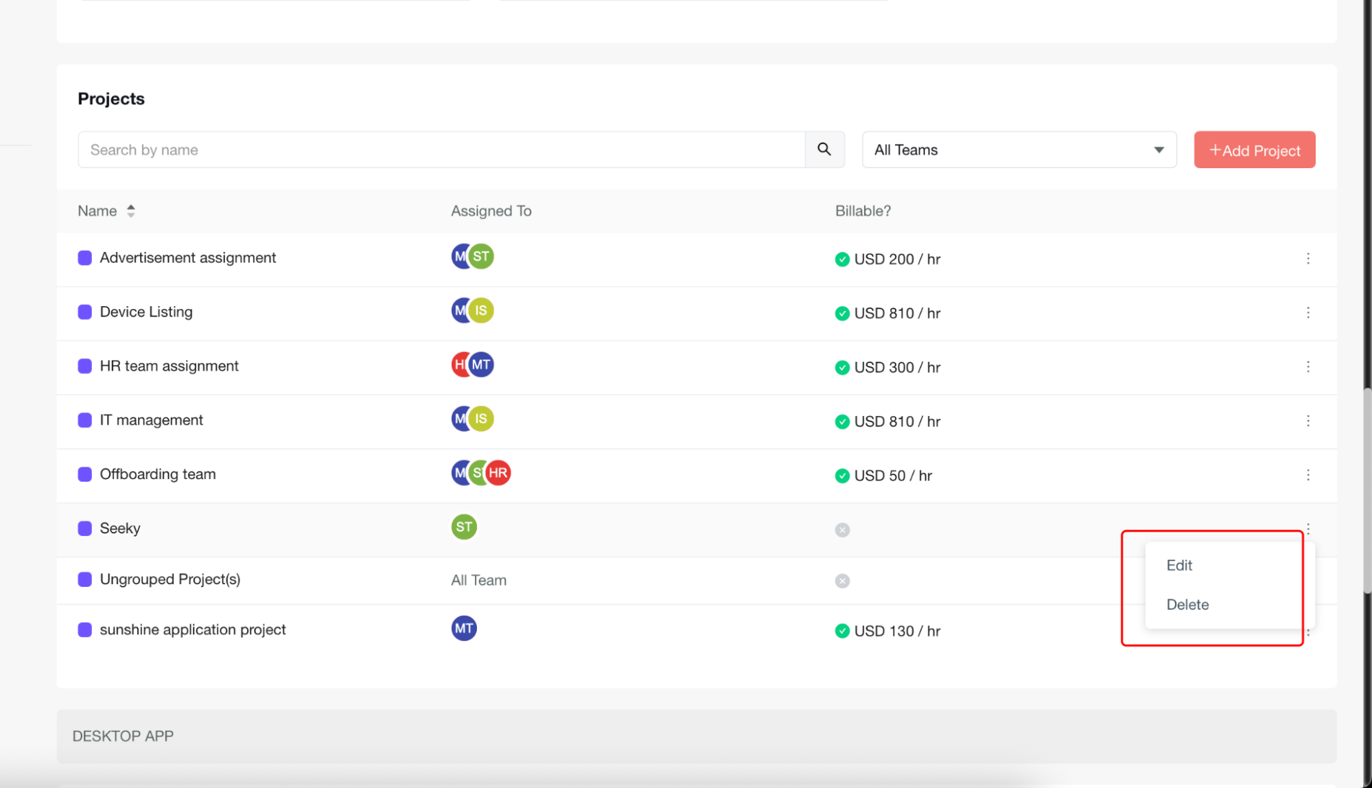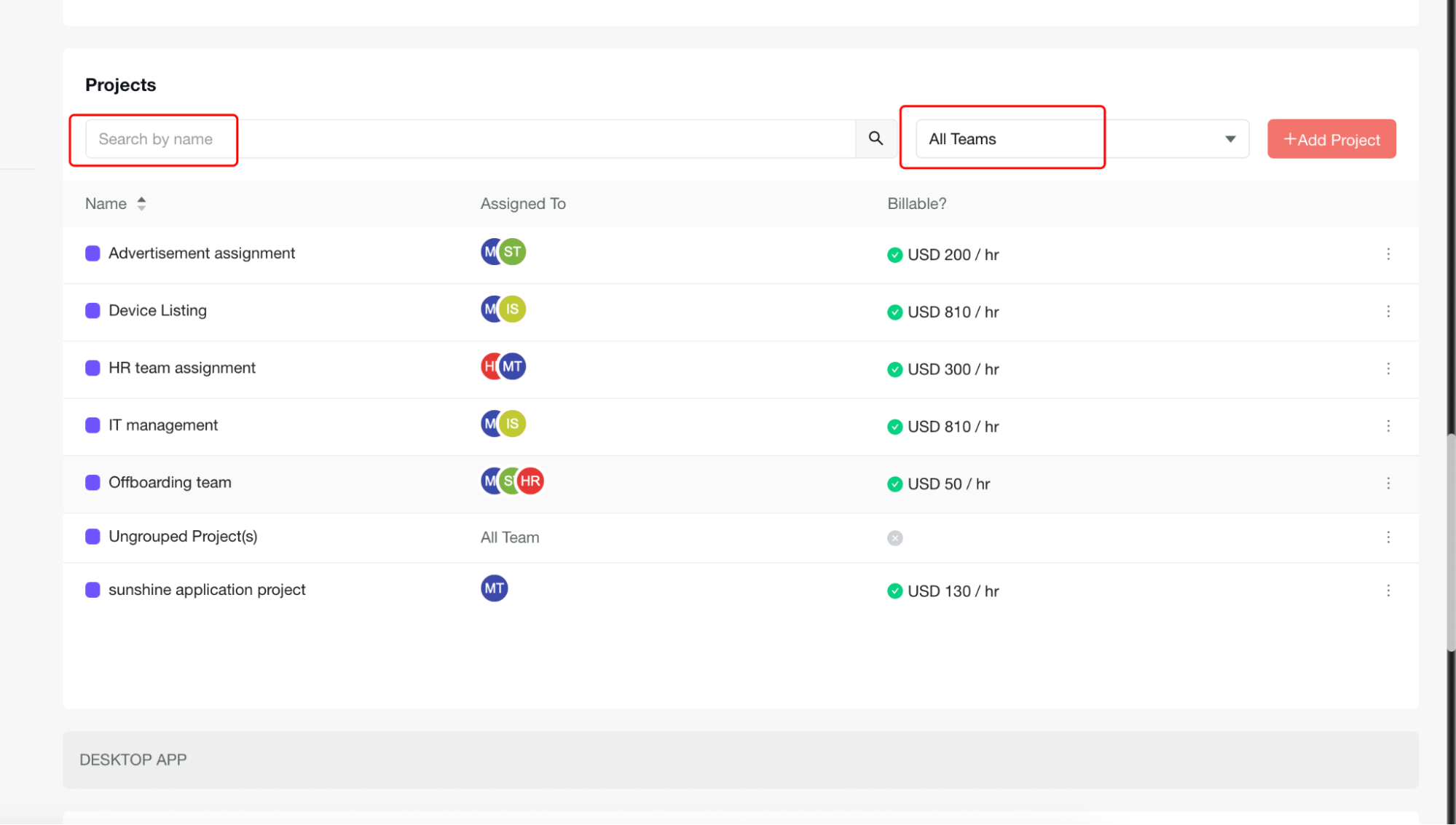 Team Assignment: Projects are assigned by team wise, showing team initials