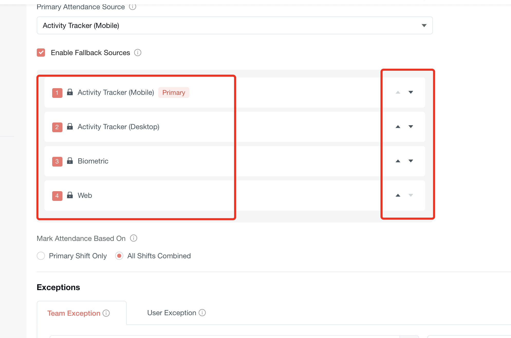 Priority Order – Admins can arrange sources in sequence (e.g., Desktop → Mobile → Biometric → Web). The top source is marked as Primary.