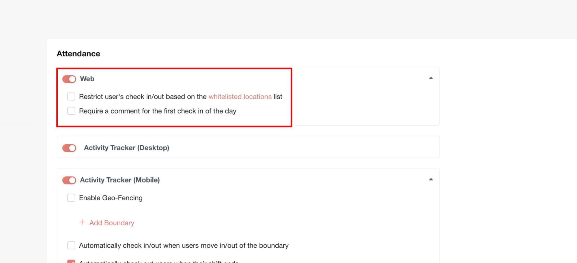 If selected: Users can check in/out only when their location matches one of the whitelisted IPs/locations defined in the system.
