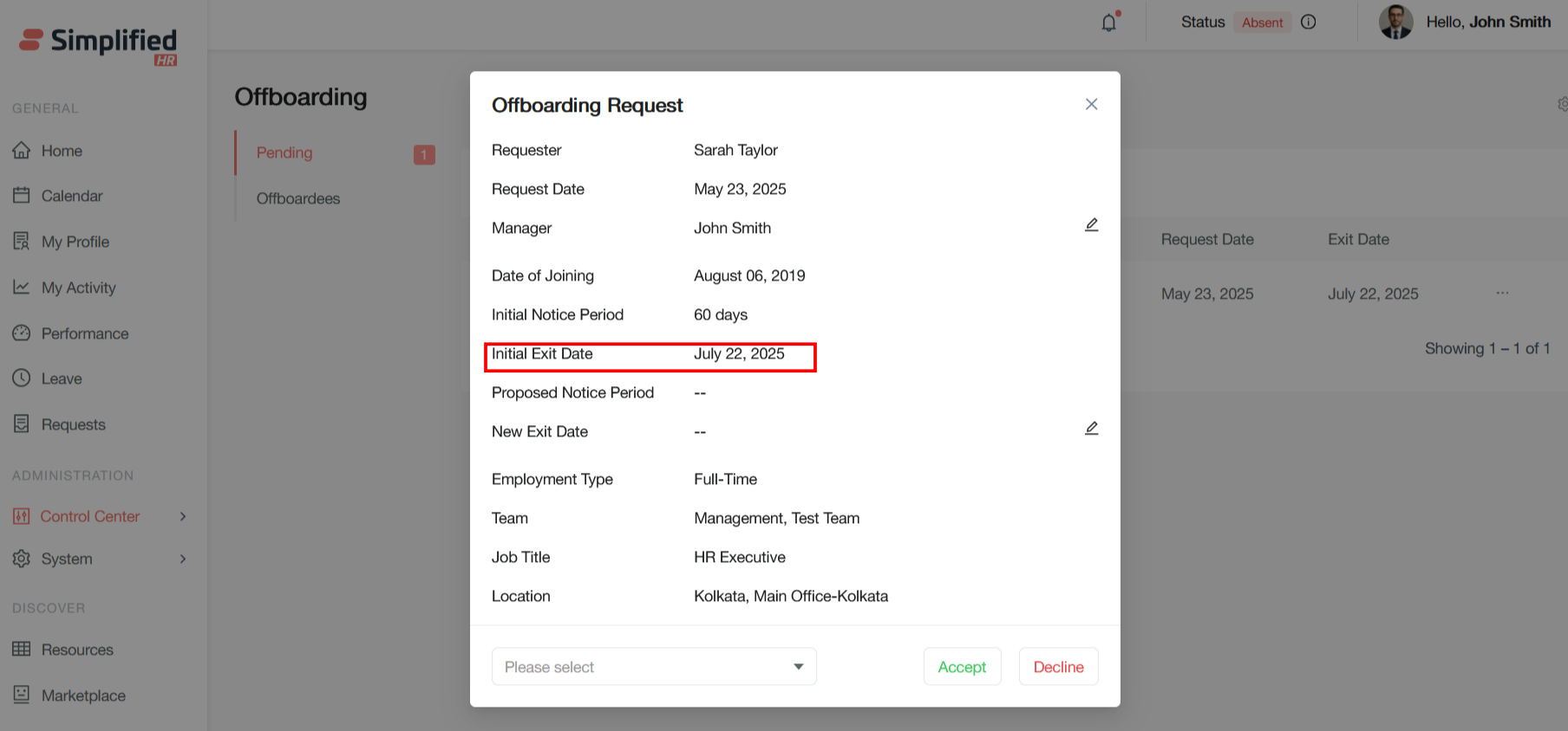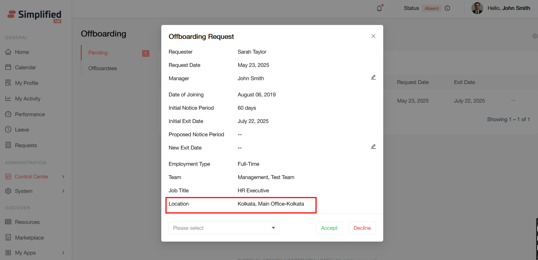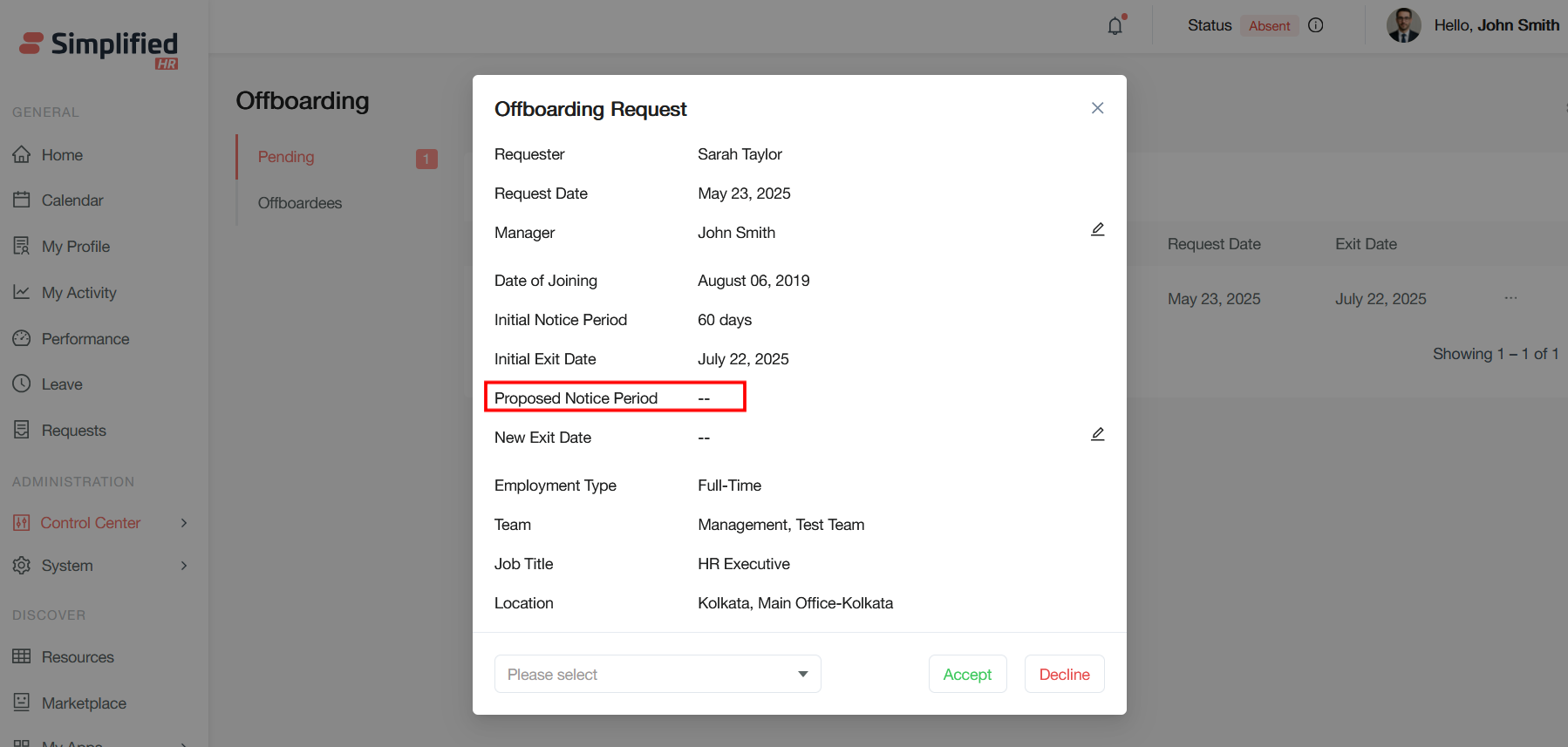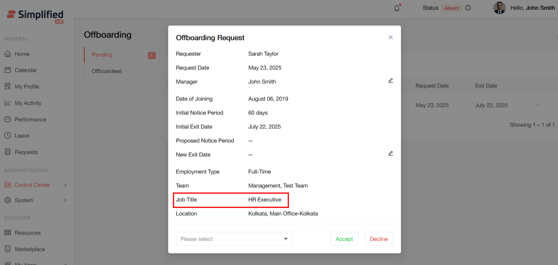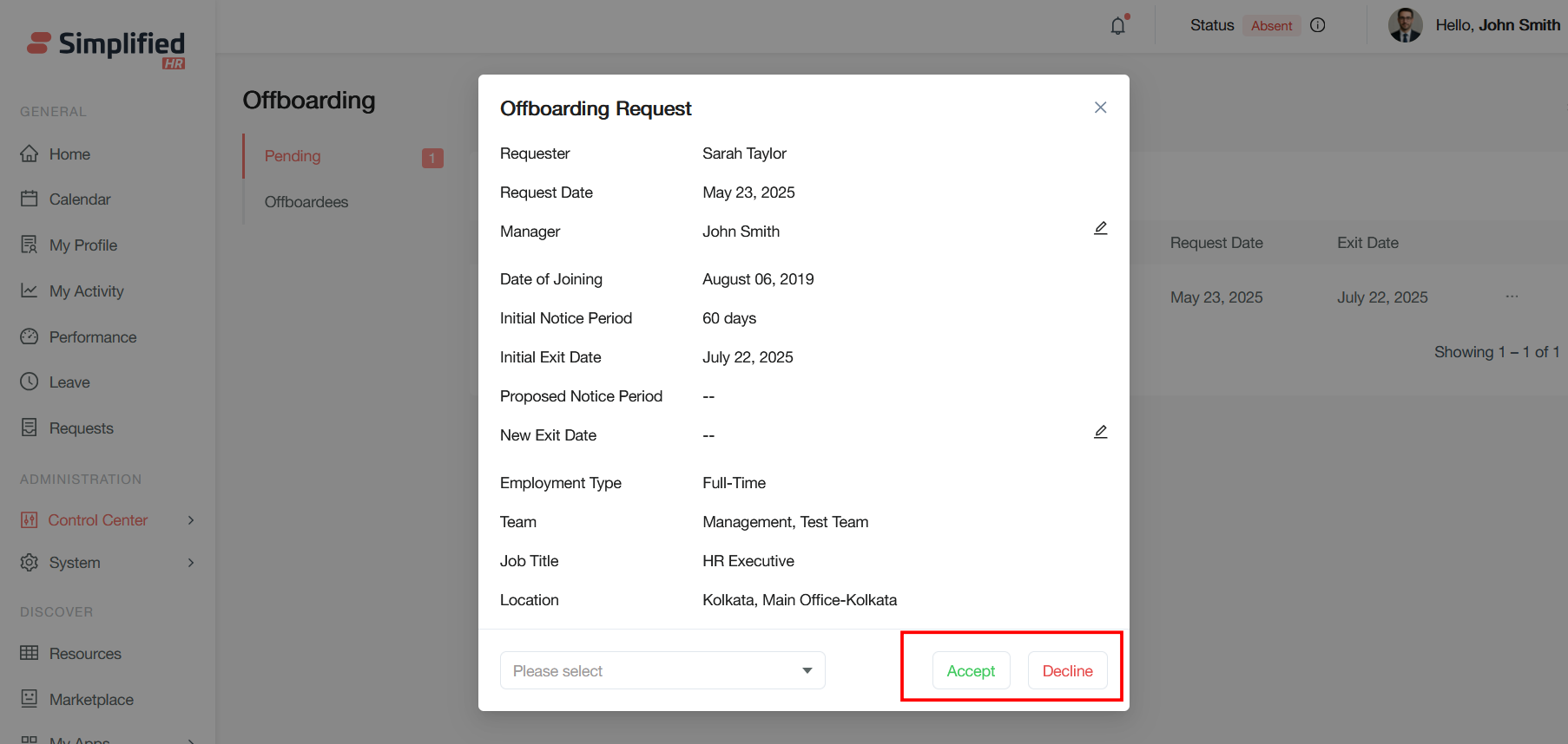 Accept/Decline Buttons: Allow the manager or HR to approve or reject the offboarding request.