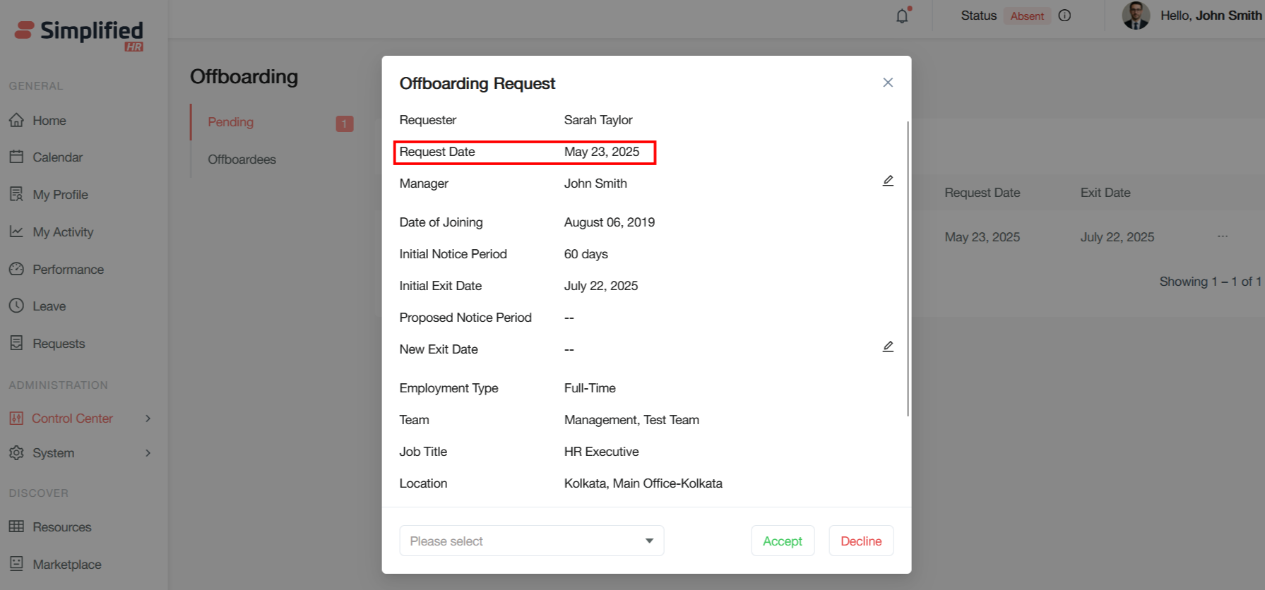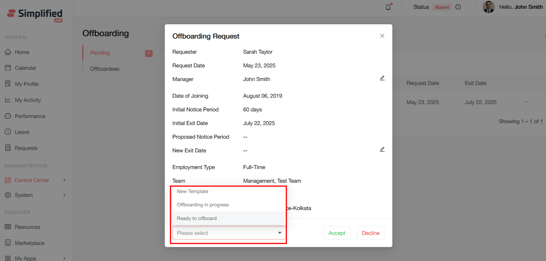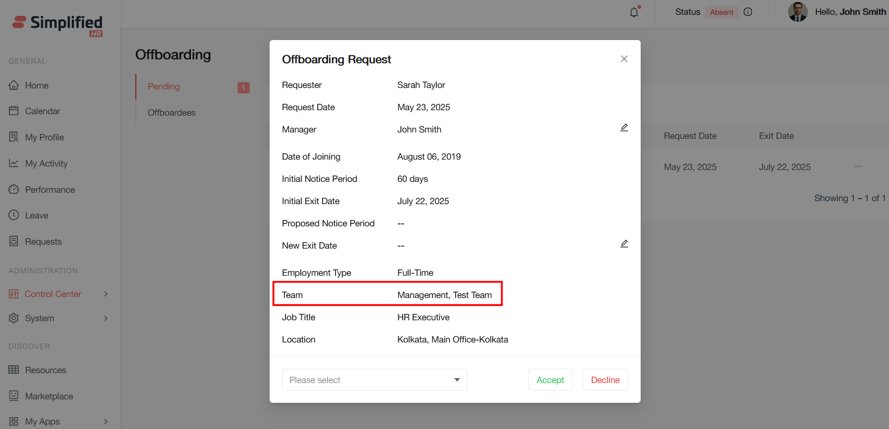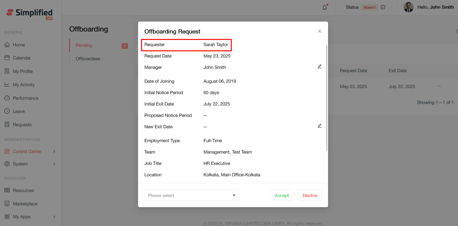Accept/Decline Buttons: Allow the manager or HR to approve or reject the offboarding request.