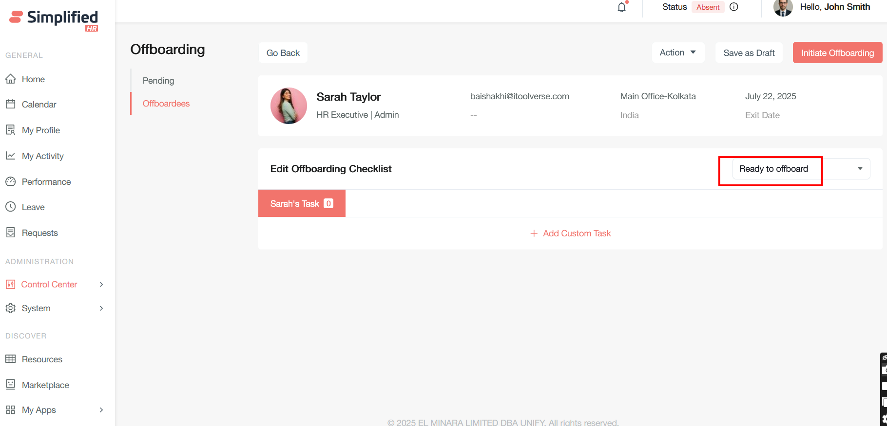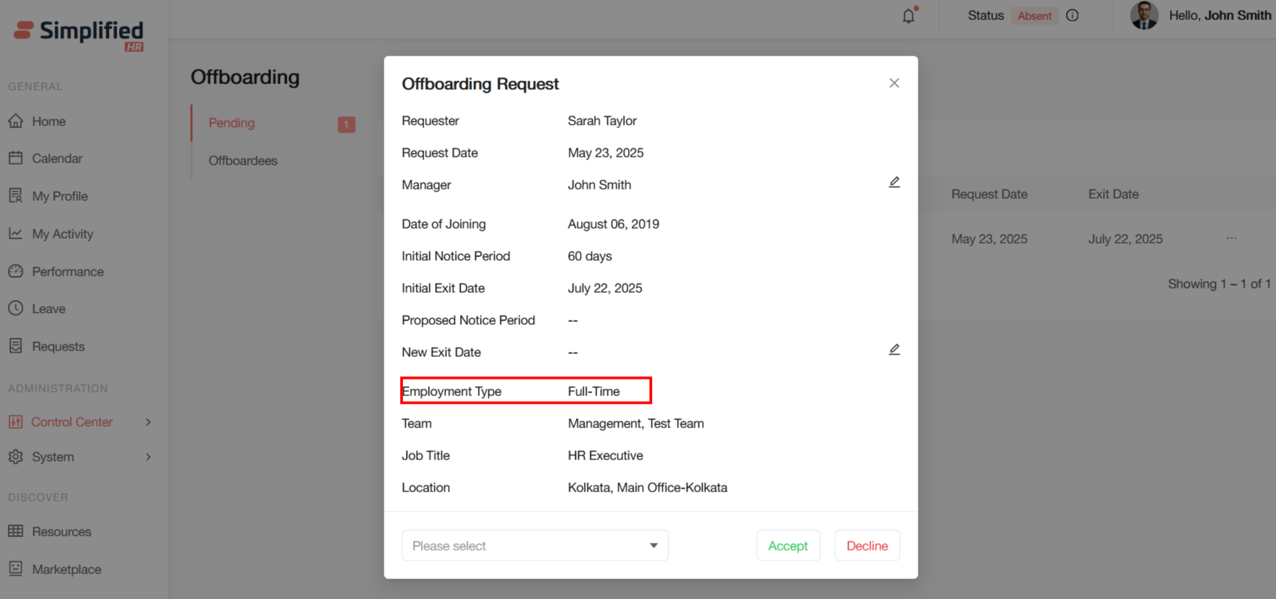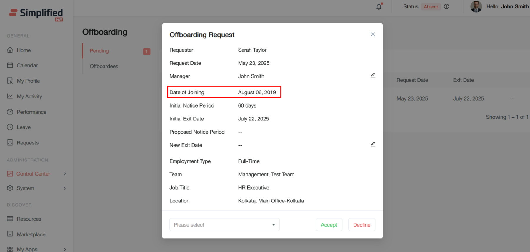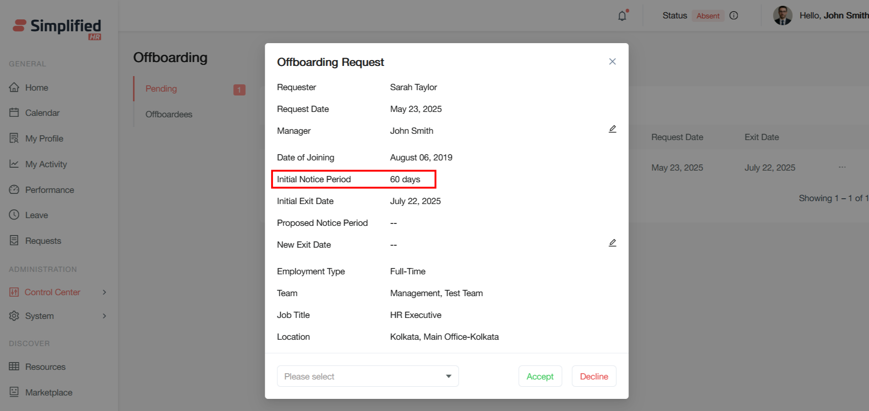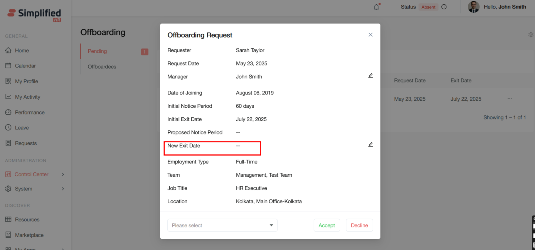 Accept/Decline Buttons: Allow the manager or HR to approve or reject the offboarding request.