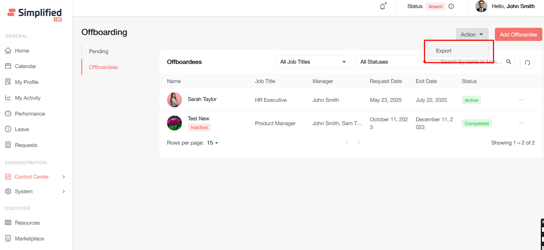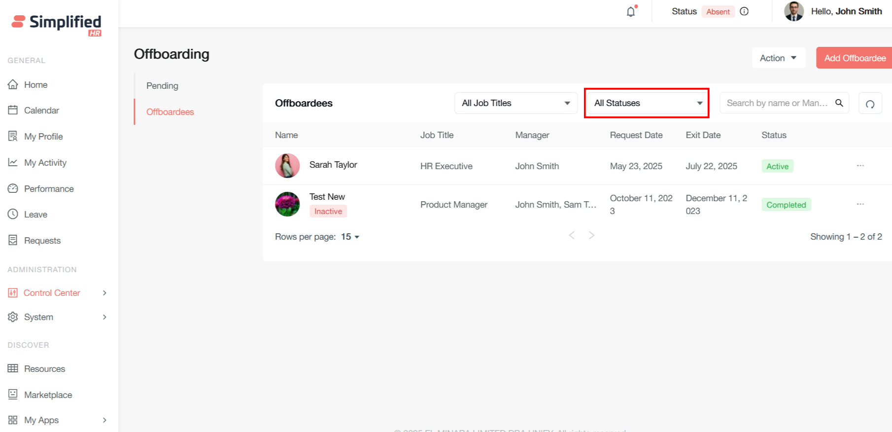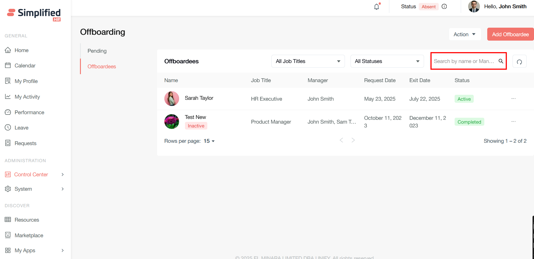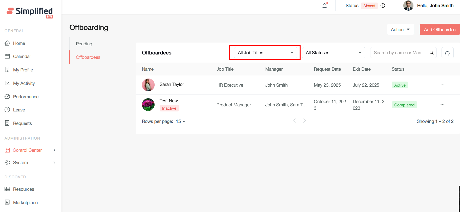 This filtering dropdown allows you to narrow down the offboardees list by specific job positions or roles. Instead of viewing all departing employees, you can filter to see only those from particular positions. This is useful for HR teams or managers who want to focus on offboarding for specific roles.