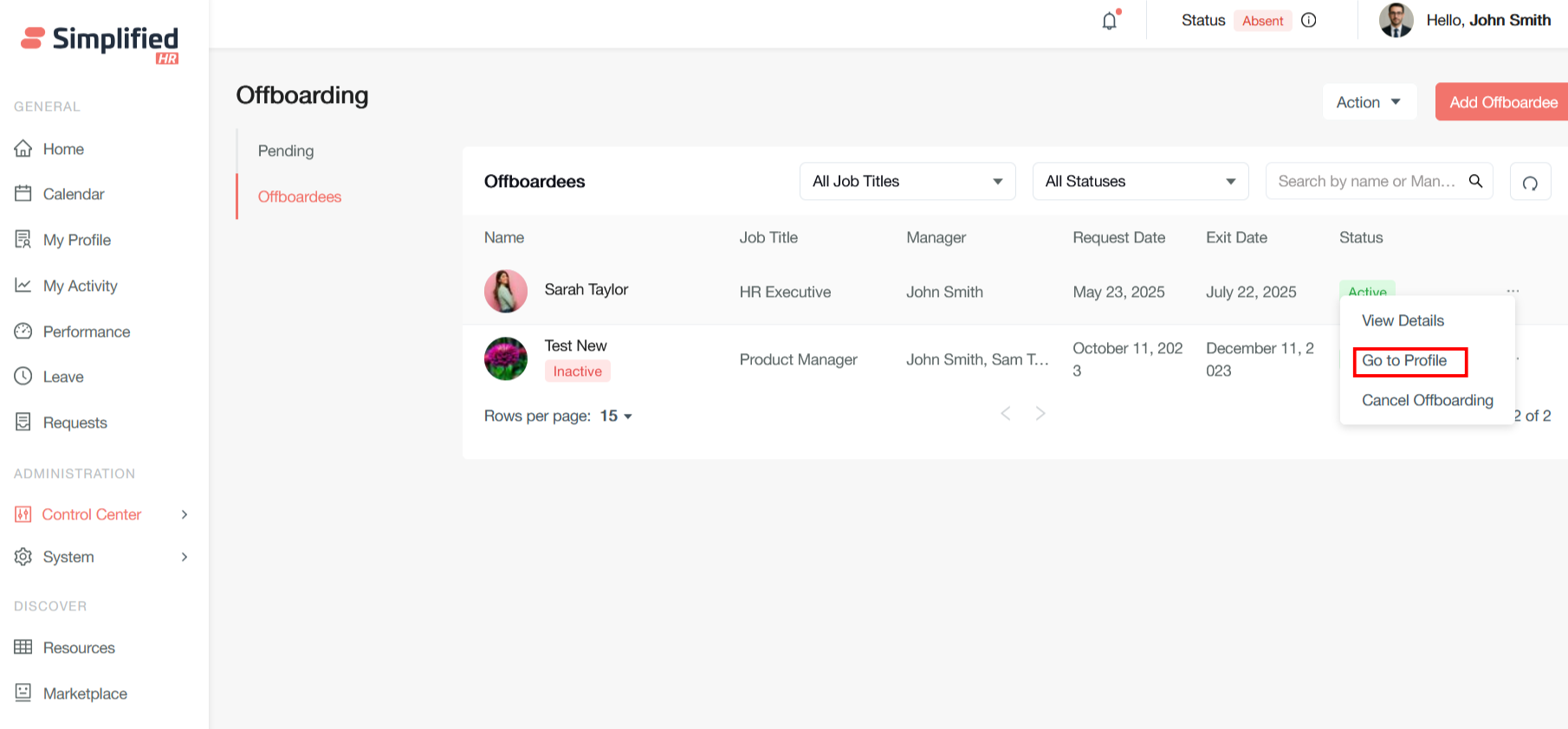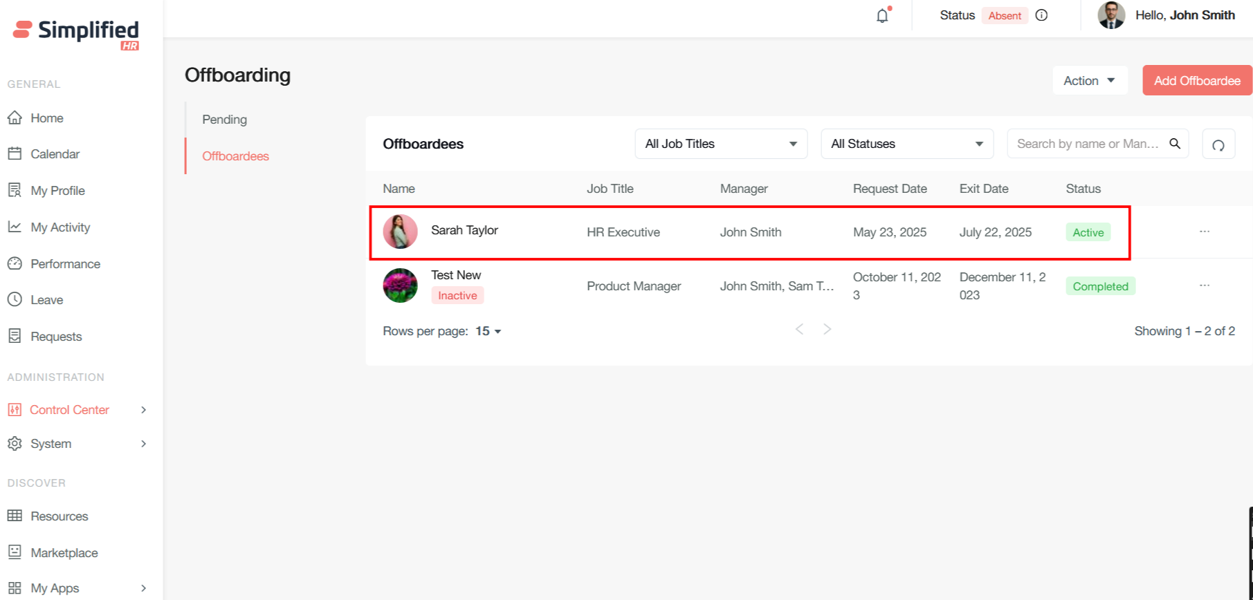Once an admin adds a checklist and accepts the offboarding of the user, the user record is displayed under the Offboardees section with active status.