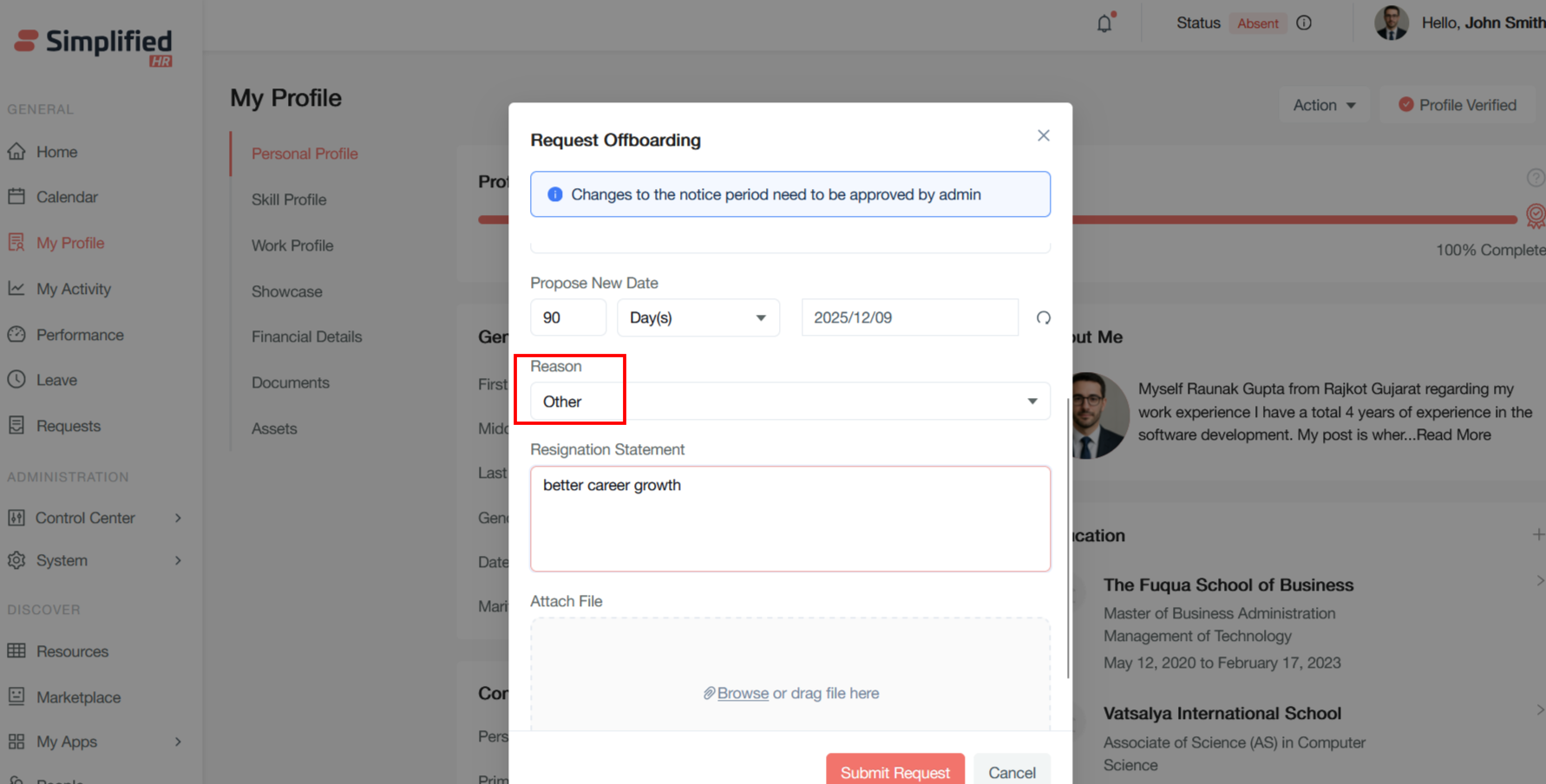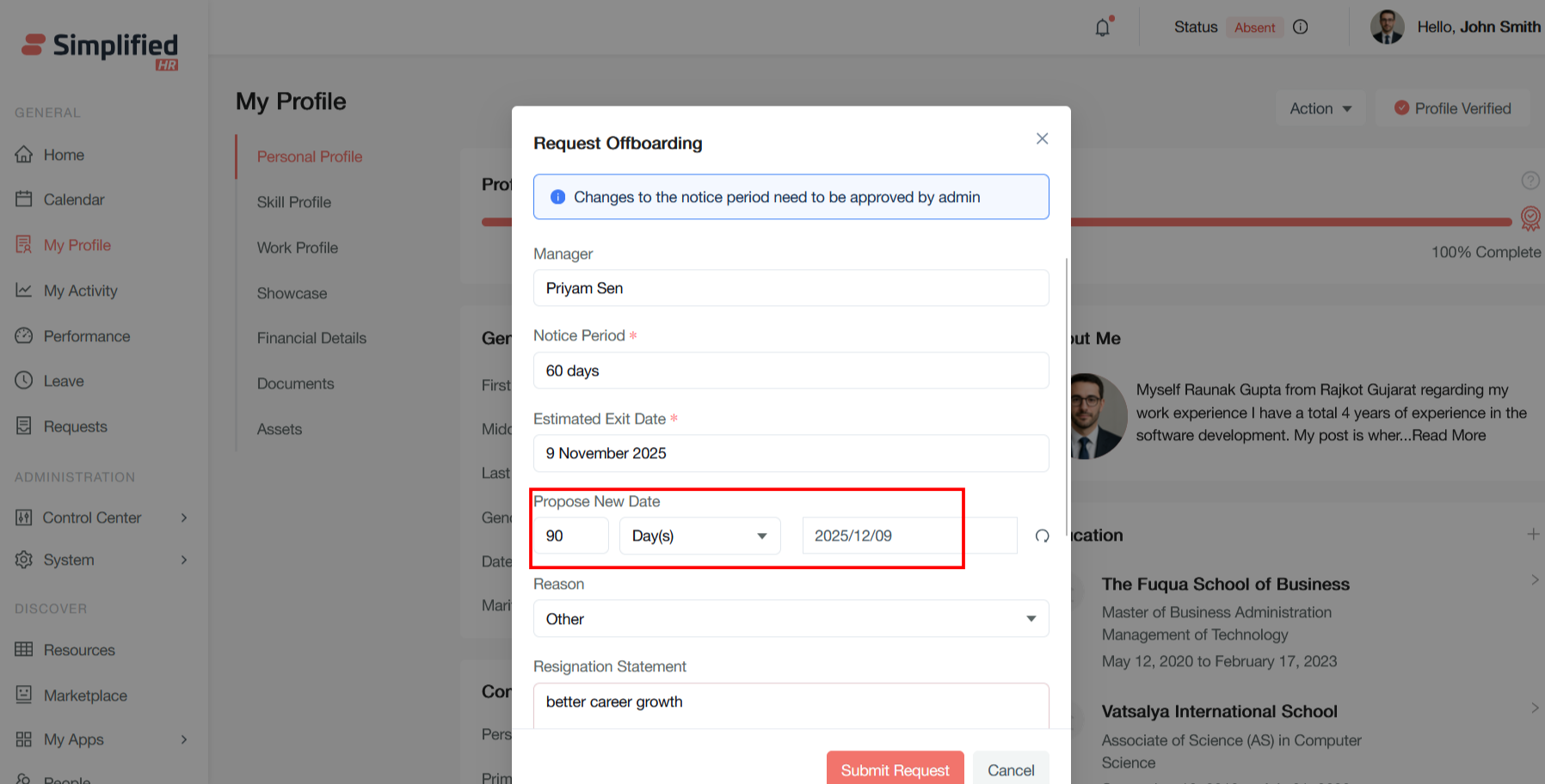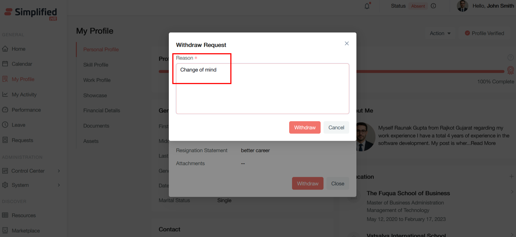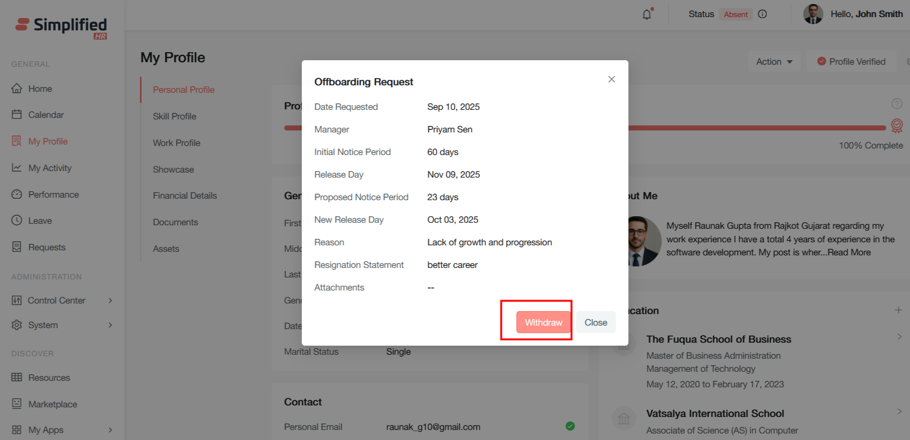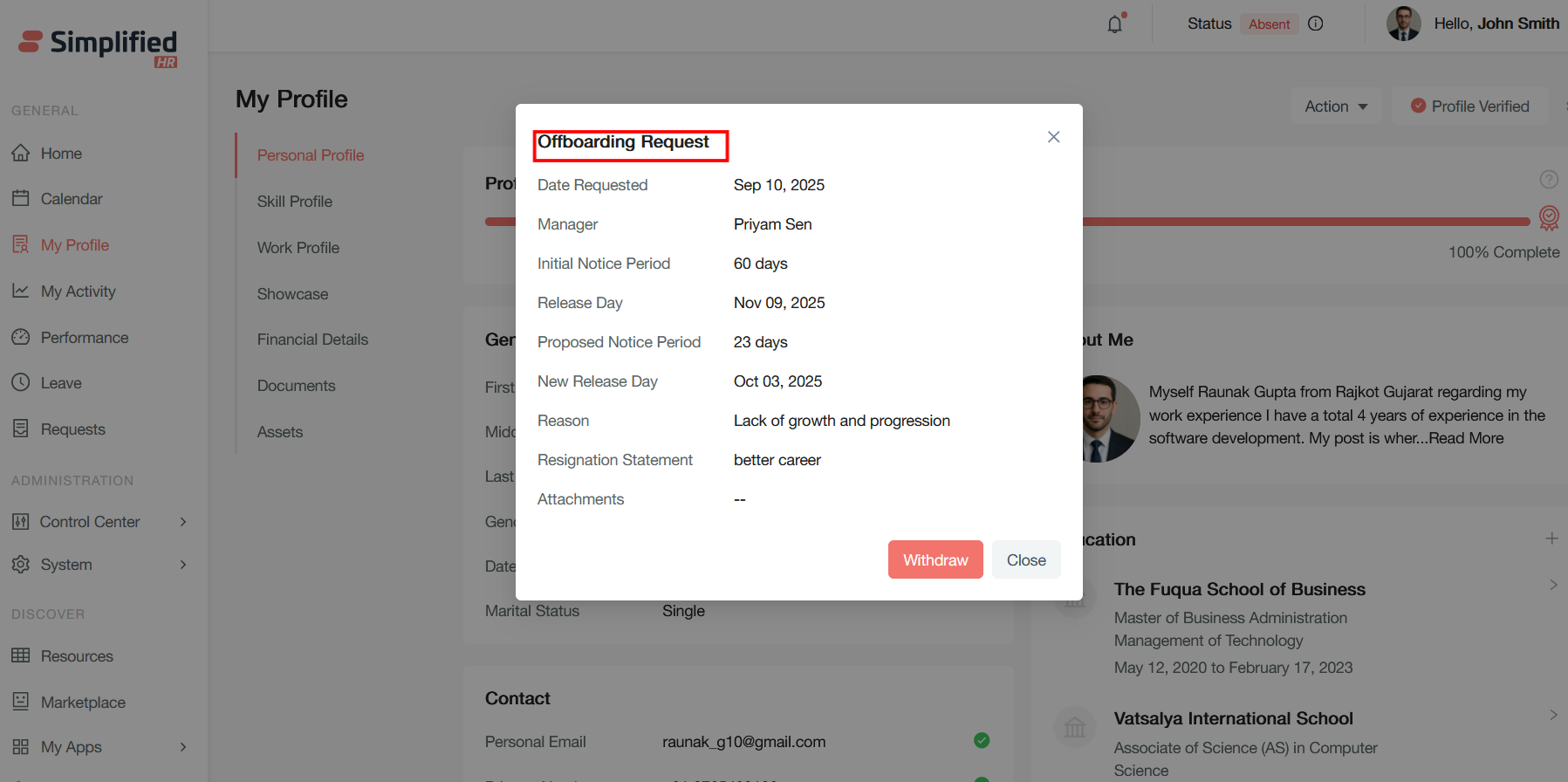 Provide a withdrawal reason and click on withdraw button to withdraw the offboarding request