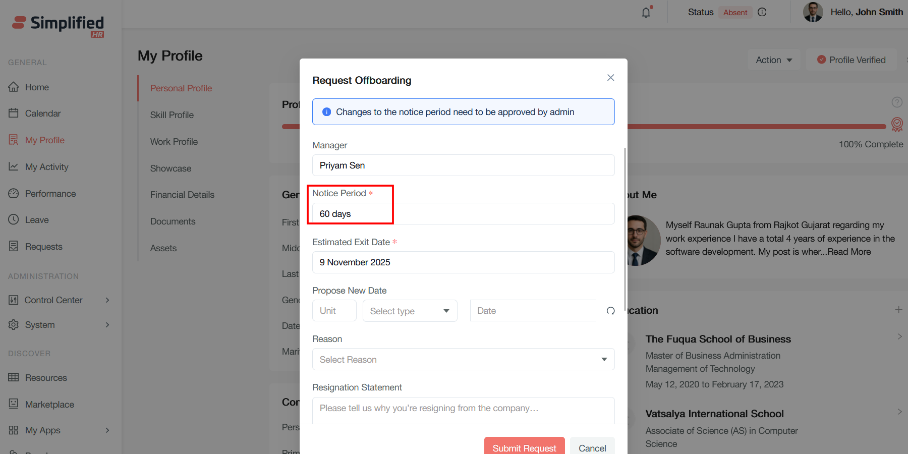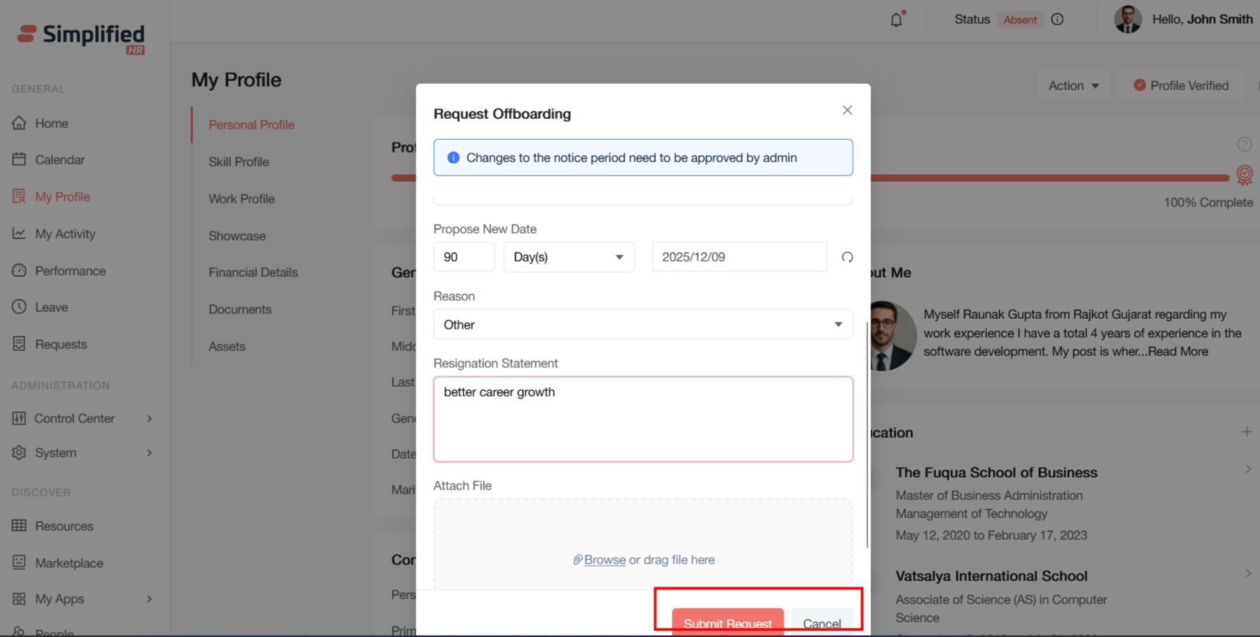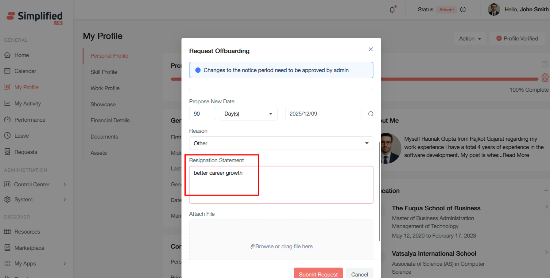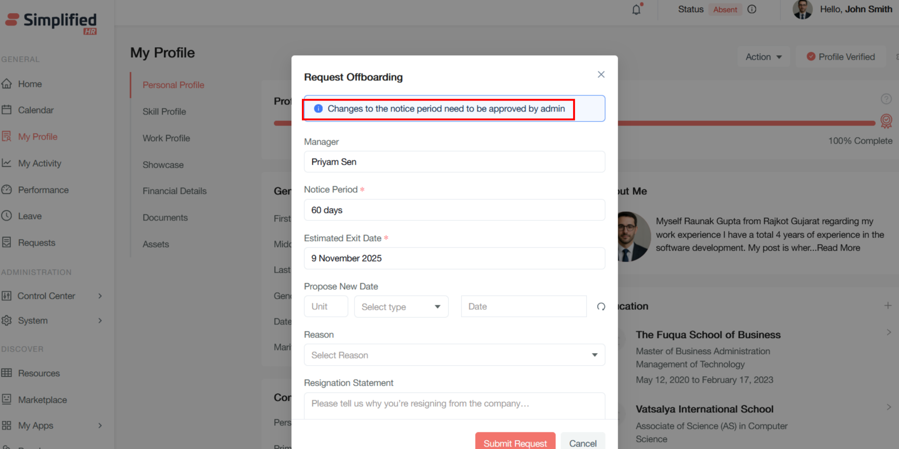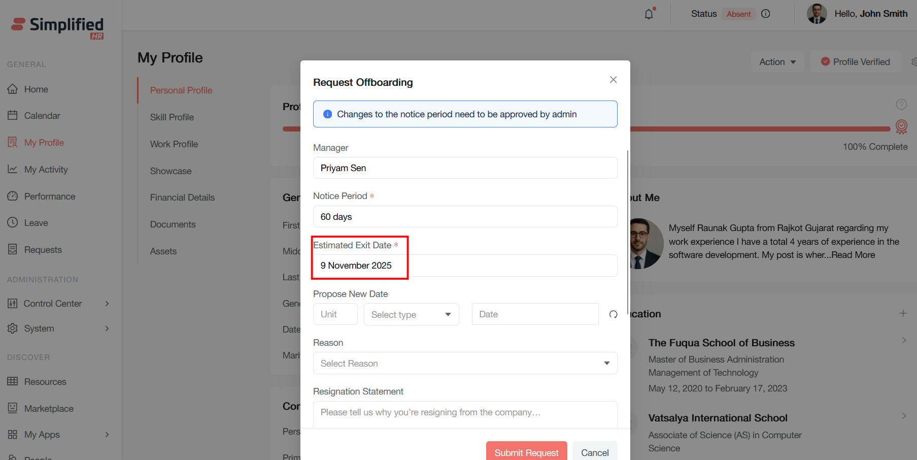 Provide a withdrawal reason and click on withdraw button to withdraw the offboarding request