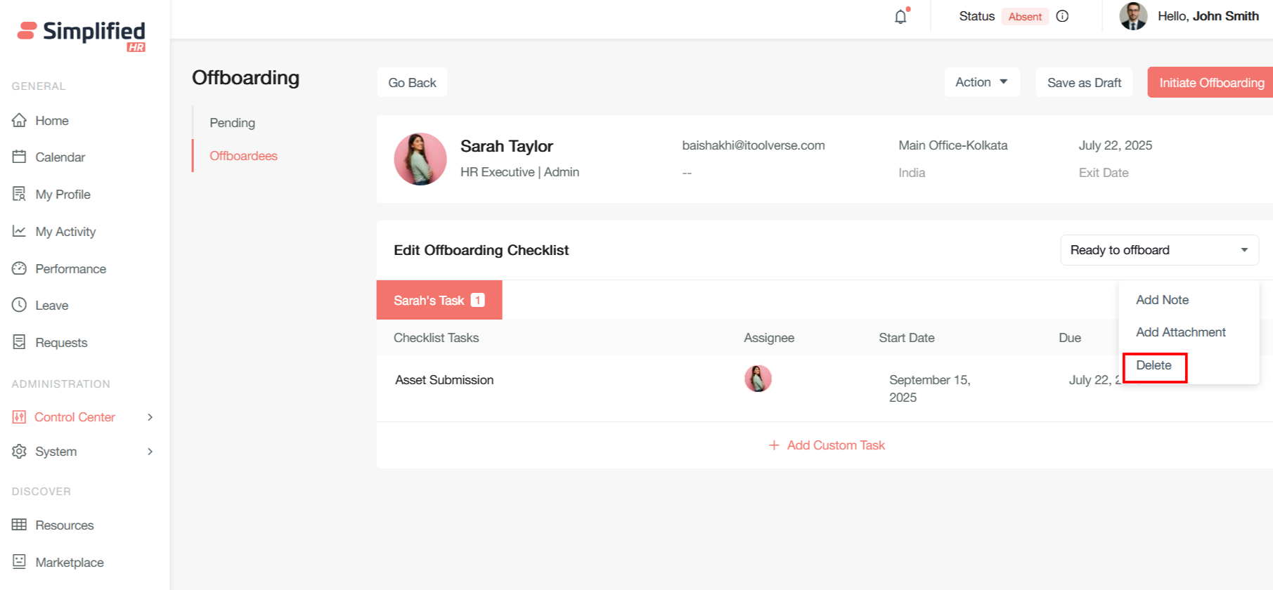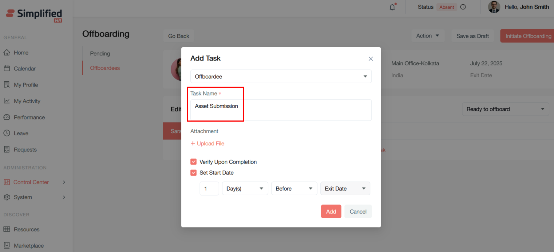Dropdown Menu: "Please select" - is the checklist task that admin selects for the offboardees to complete the task before he leaves the organization.