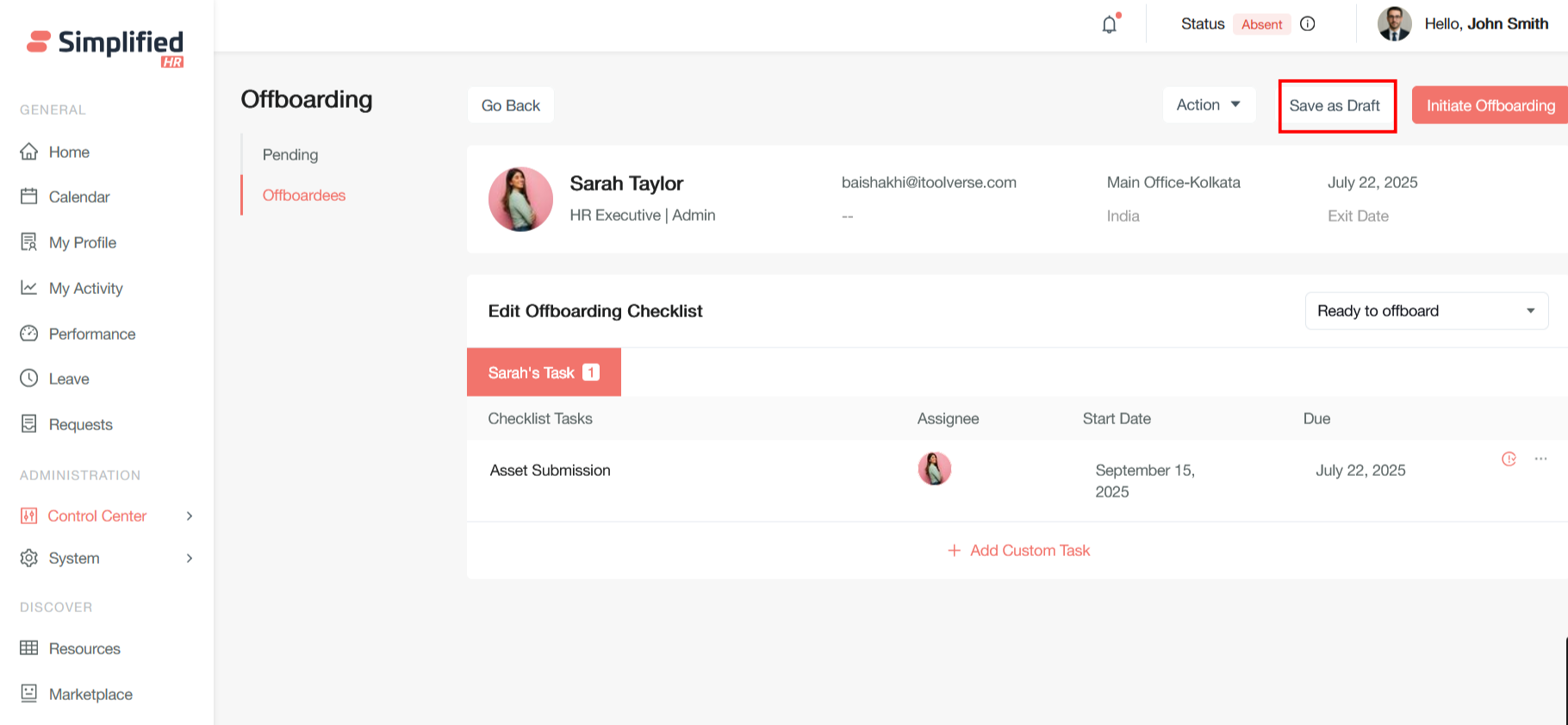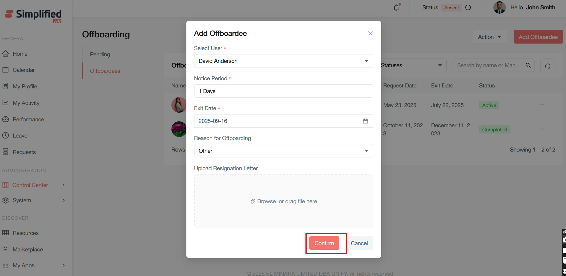 - Function: Finalizes and submits the offboarding request to the approval workflow