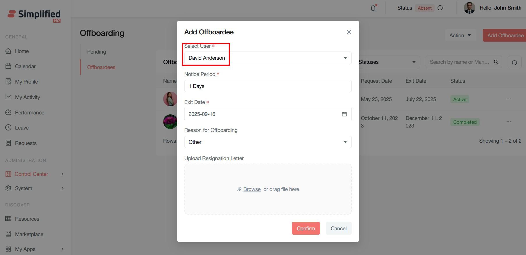 This dropdown field allows you to choose which employee is being offboarded. In this case, "David Anderson" is selected. This links the offboarding process to the specific employee's HR profile and ensures all departure activities are tracked under their record.