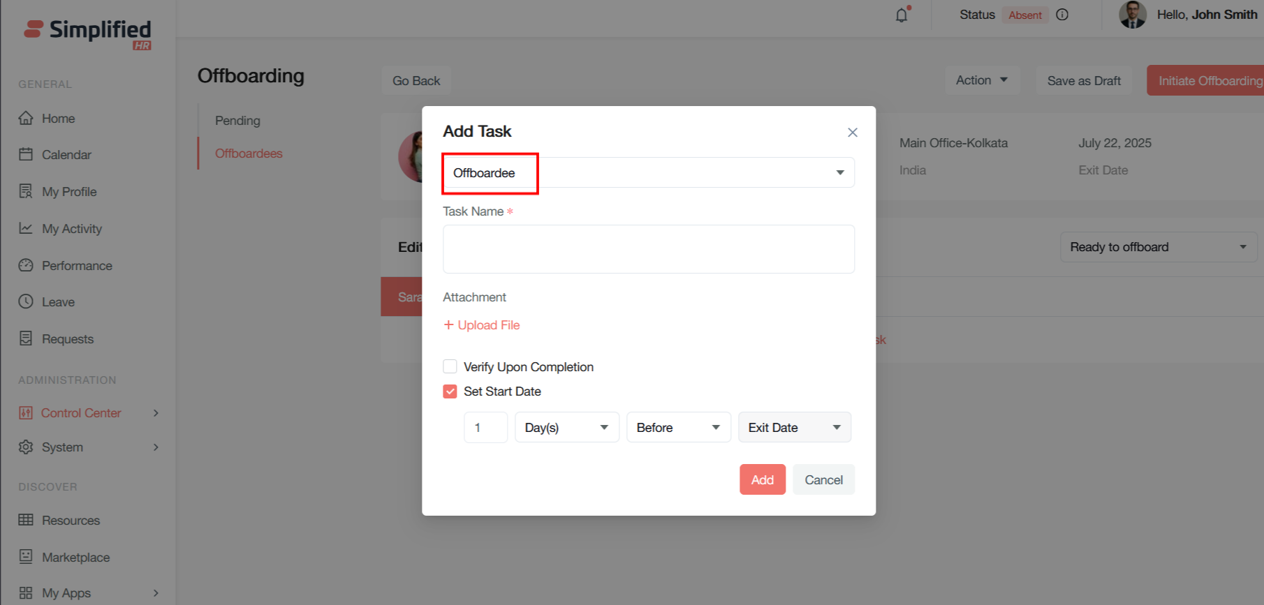 Add Offboardee pop up modal will open after you click on the Add Offboardee button.