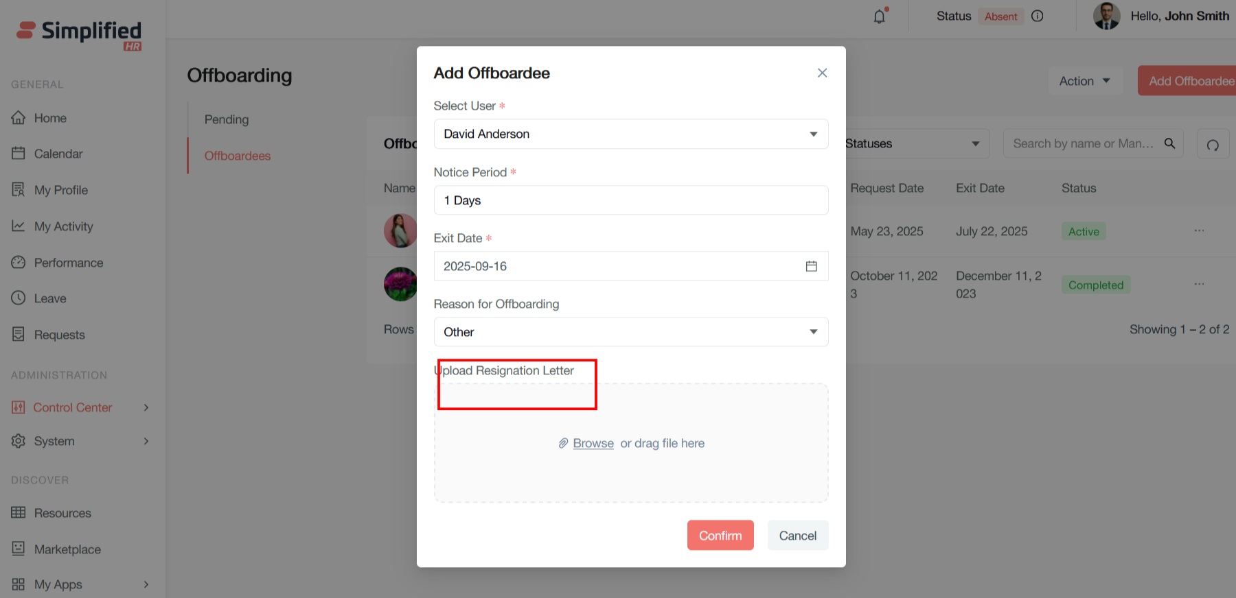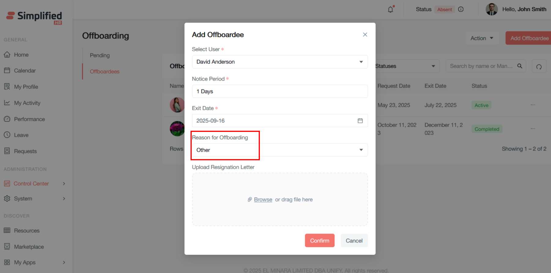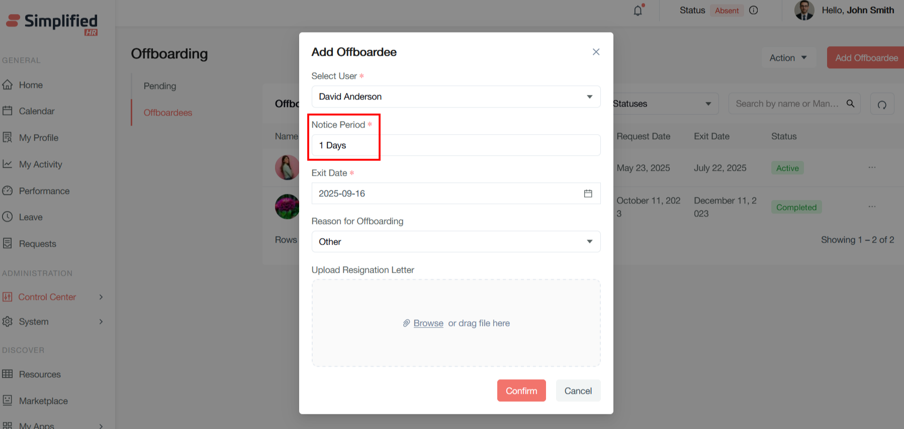 Note: If any offboarding is raised previously by the member or added by the admin, and thereafter not cancelled or rejected, then raising a duplicate offboarding request will be restricted.