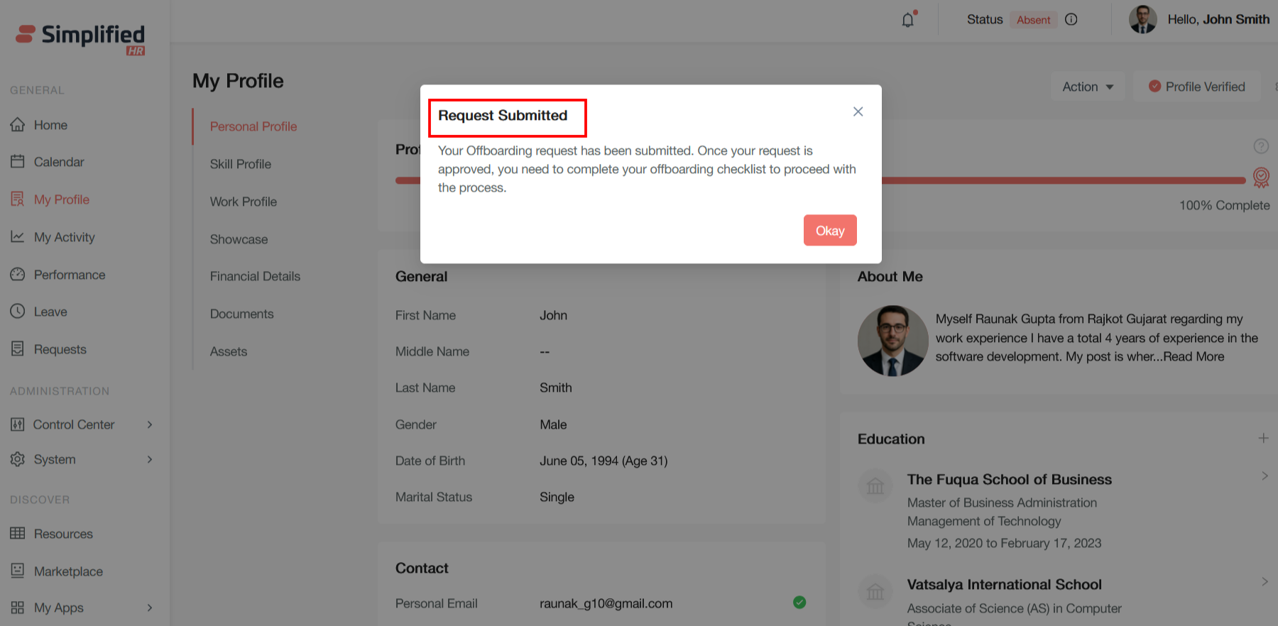 A request submission confirmation pop up will appear after submitting the offboarding.