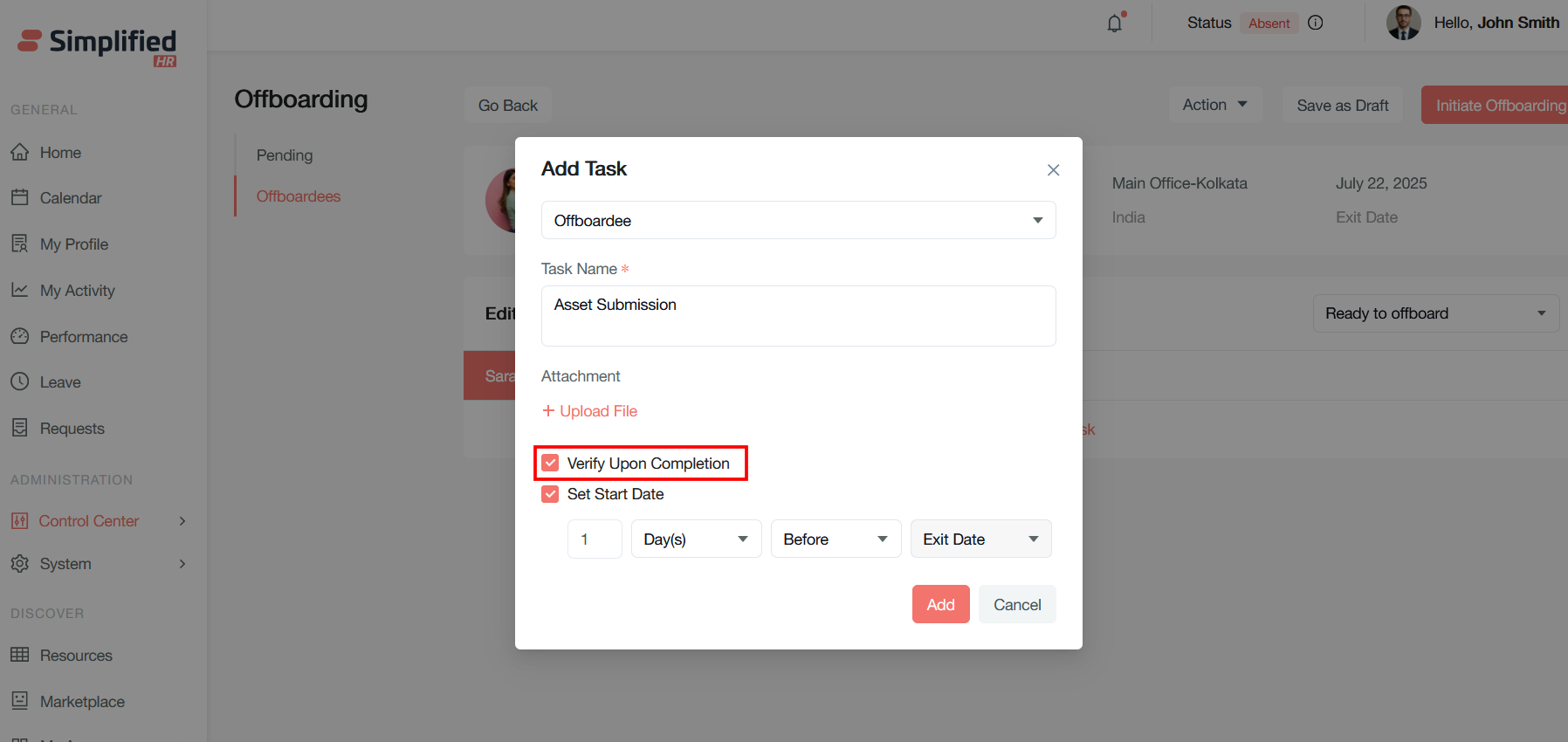 When enabled, this option likely requires additional verification or approval before the task is marked as complete. This adds an extra layer of oversight for critical offboarding tasks that need confirmation from supervisors or HR.